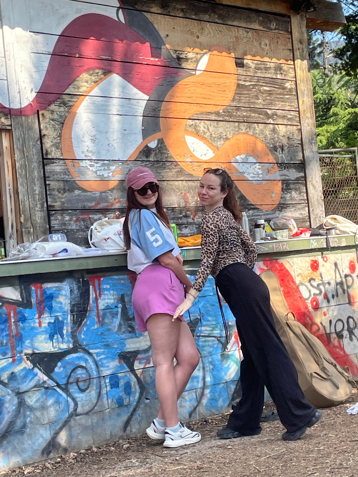Two young women are posing for a photograph in an outdoor setting, likely in Kamenovo, Montenegro, characterized by a vibrant, graffiti-covered environment. The image is taken during daytime under briβ¦read more