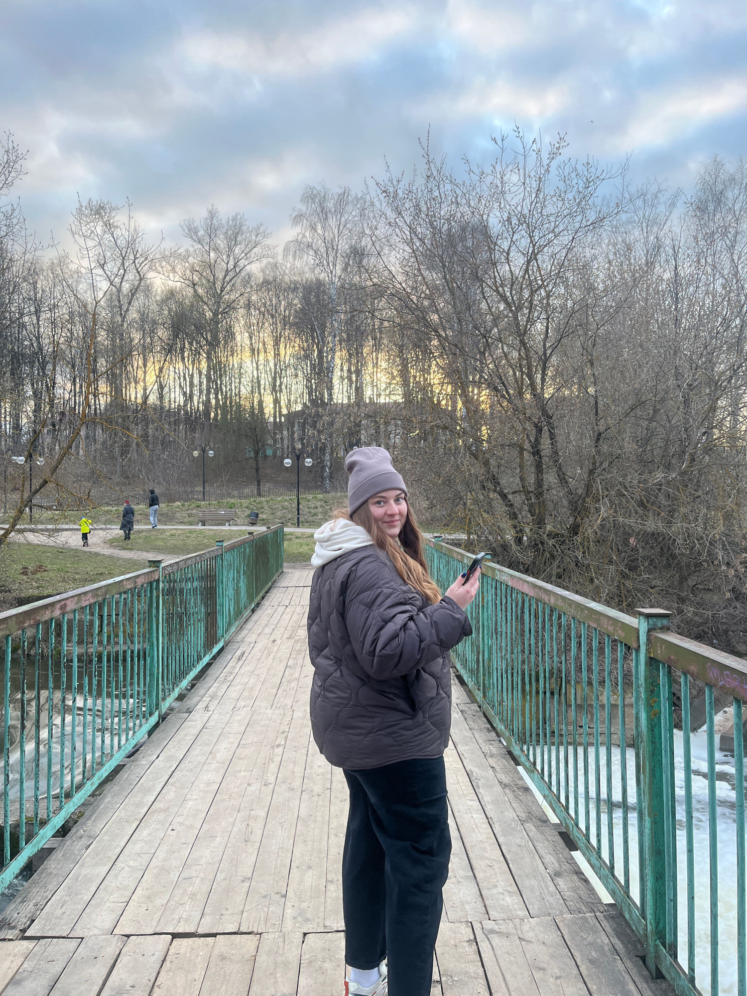 A woman wearing a grey beanie, white scarf, grey puffer jacket, and black pants stands on a wooden bridge with green metal railings, holding a mobile phone. The bridge overlooks a body of water, likel…read more