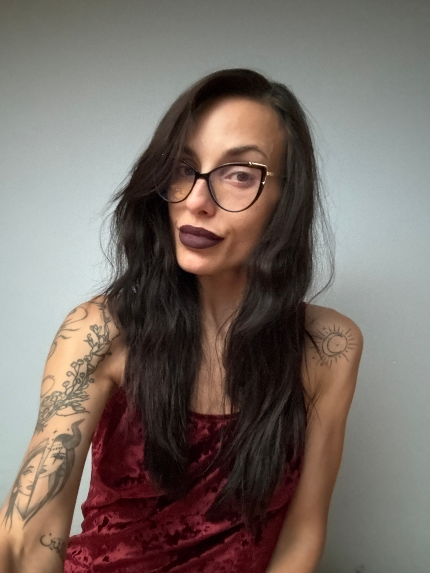 A woman with long, dark hair, glasses, and dark lipstick poses indoors against a light gray wall. She wears a dark red, textured top. Tattoos are visible on her left shoulder and arm; one tattoo on he…read more