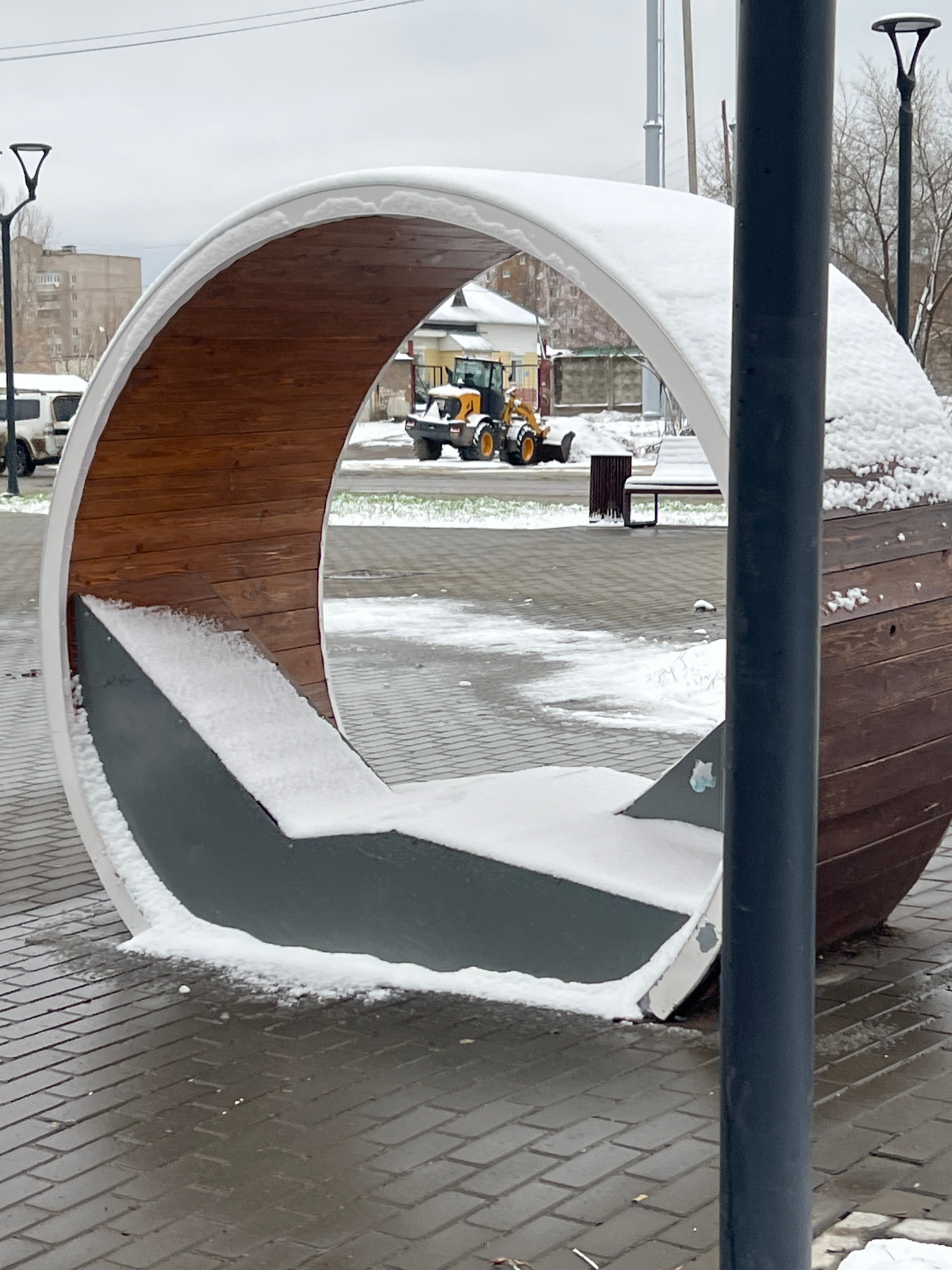 The image shows a circular bench structure in Chaikovsky, Russia, partially covered in snow. The bench is made of wood and gray metal. It is located on a brick-paved surface. Through the bench's openi…read more