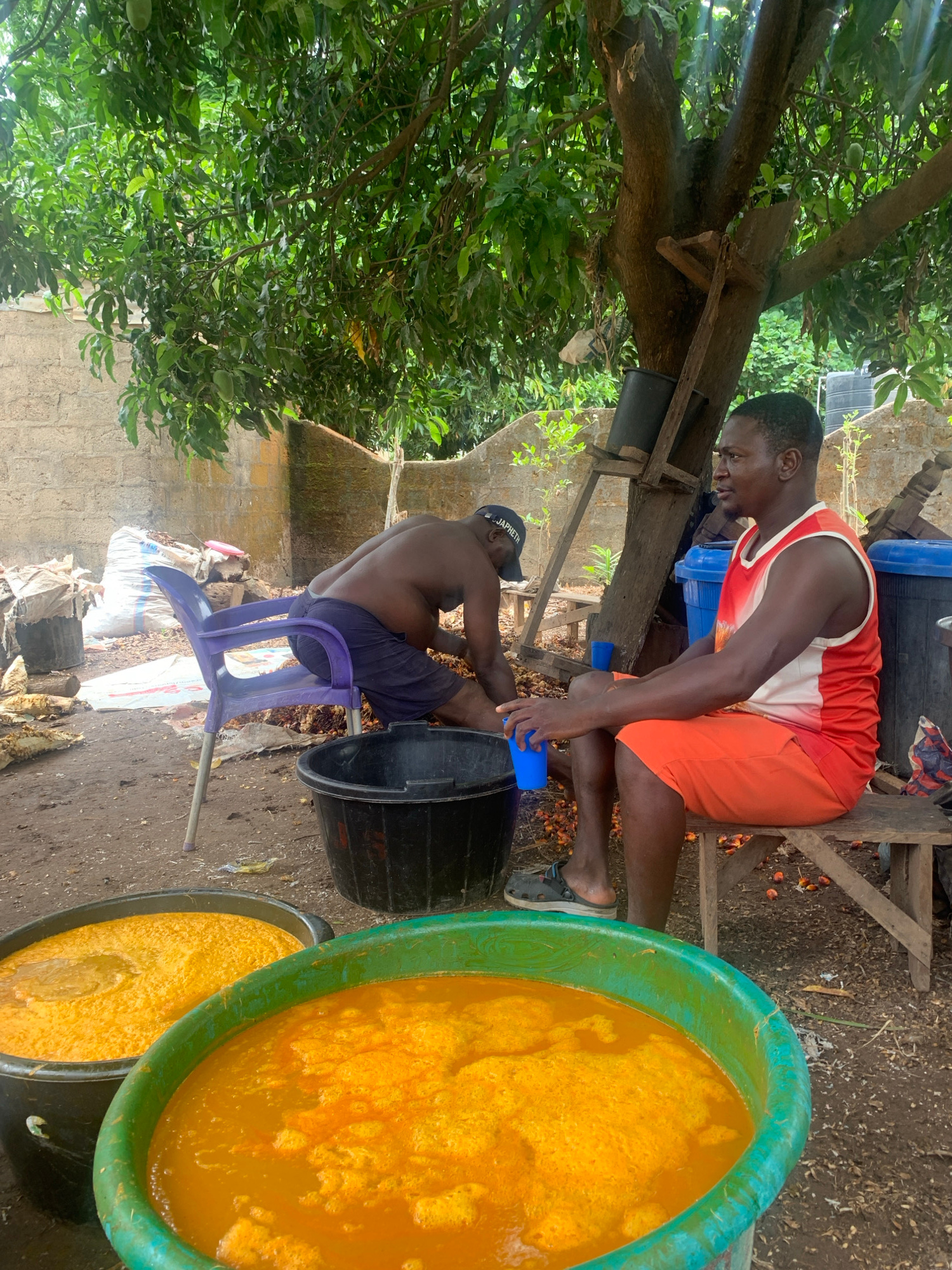 Two men are outdoors in Akwanga, Nigeria, working on processing a bright orange liquid in large basins. One man sits on a makeshift wooden bench, wearing an orange and white tank top and orange shortsβ¦read more