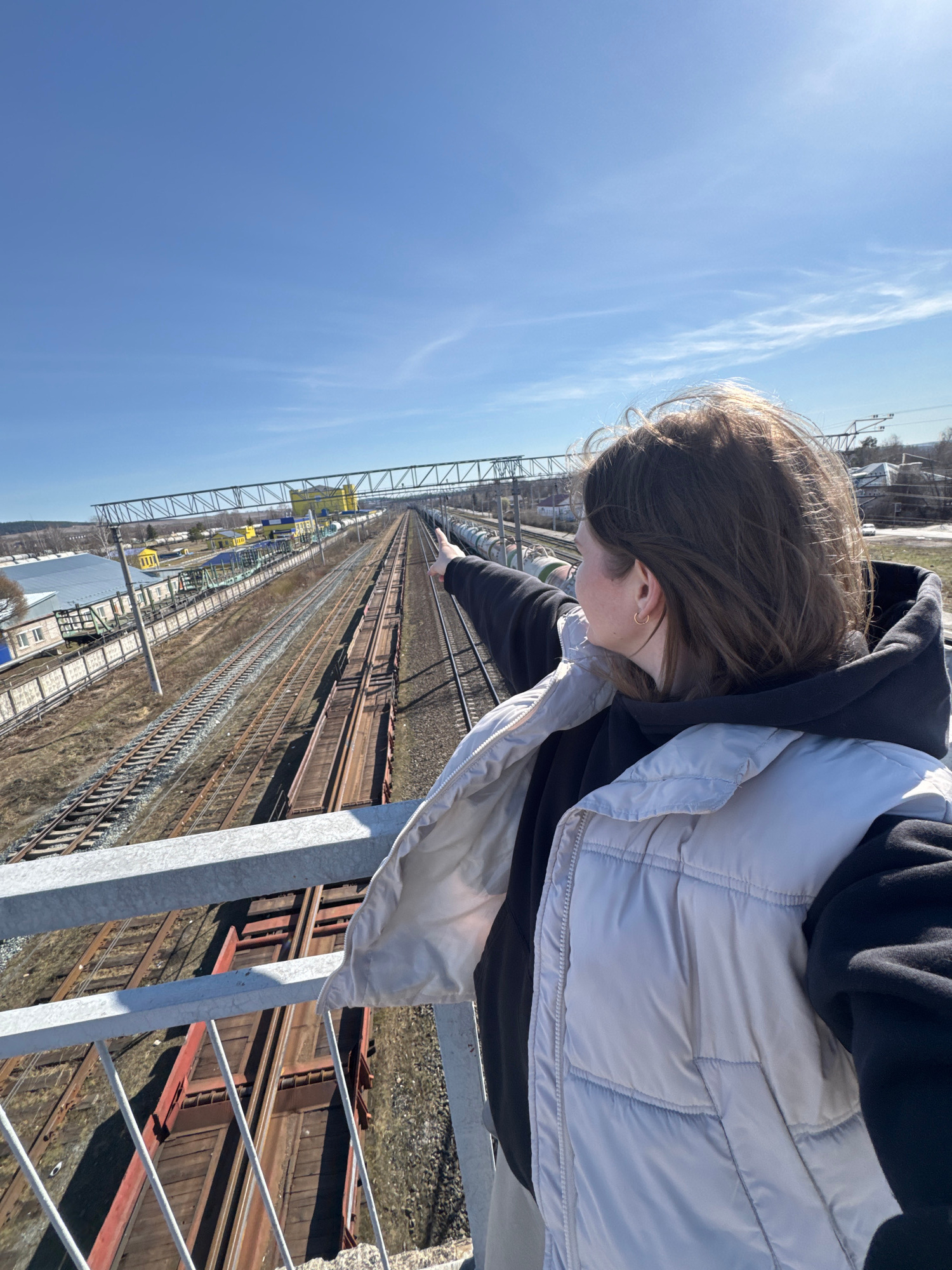 The image captures a person, likely female, viewed from a side profile, looking down from an elevated structure onto an expansive railway system. She wears a black hoodie underneath a light grey or si…read more