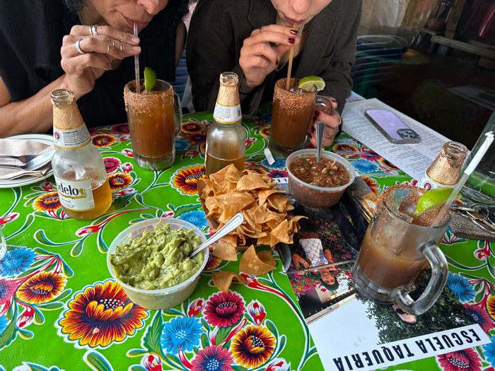The image displays an overhead perspective of a table at Escuela Taqueria in Los Angeles, United States of America. The table is covered by a vivid green tablecloth patterned with large, colorful flor…read more