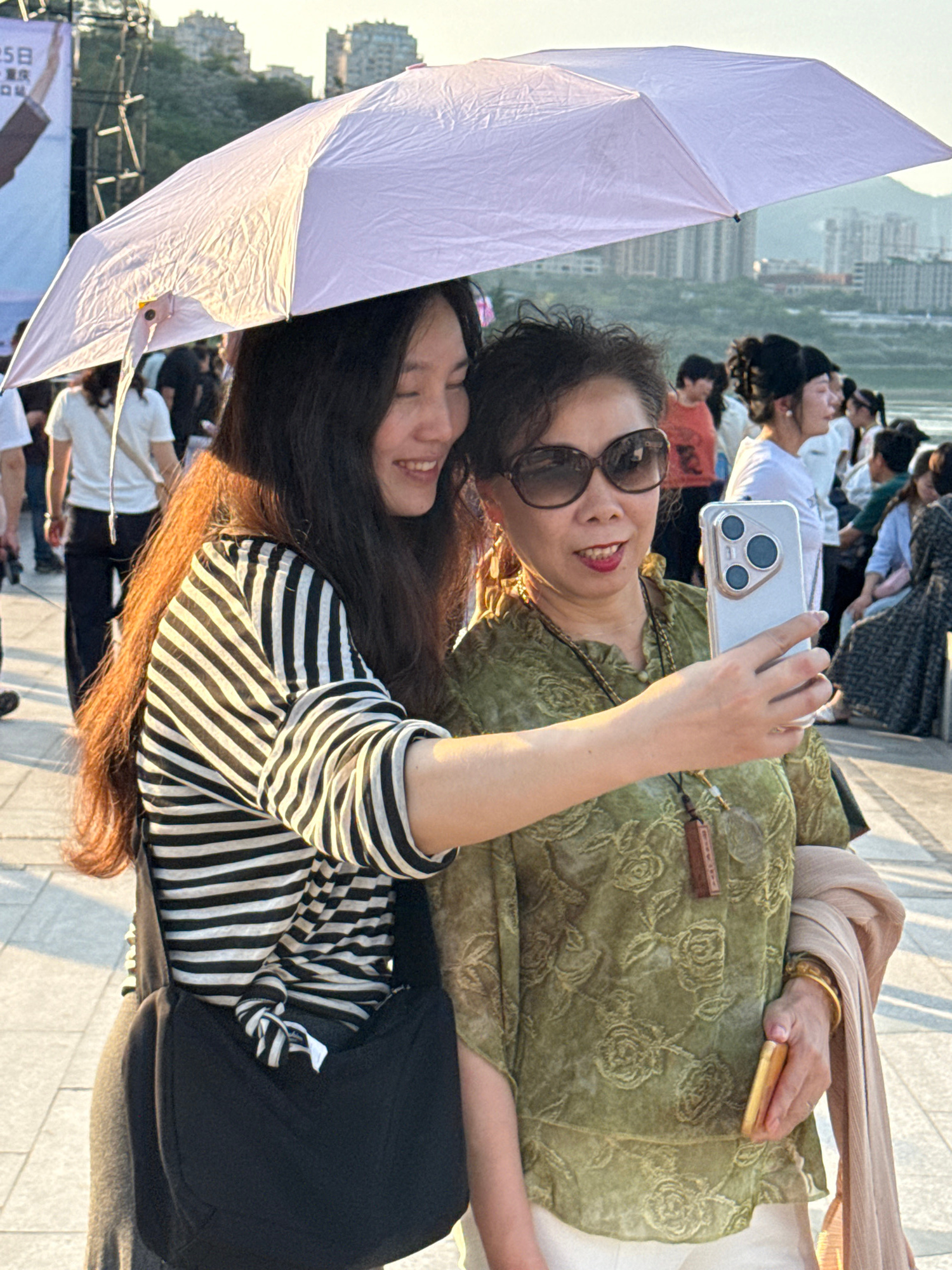 Two women are in the foreground, taking a selfie with a smartphone. One woman wears a green floral blouse, sunglasses, and a gold bracelet. The other woman has long, dark hair and wears a black and wh…read more