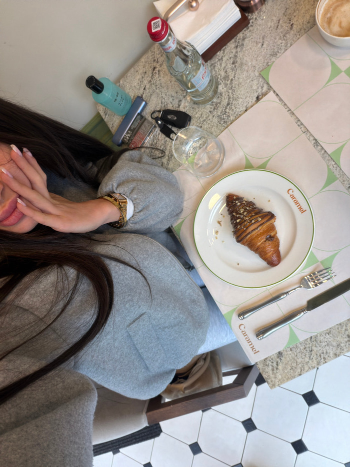 An overhead view inside Caramel Cafe & Restaurant, located in Yerevan, Armenia, displays a person seated at a speckled light-colored table. The individual has long, dark hair and wears a grey long-sle…read more