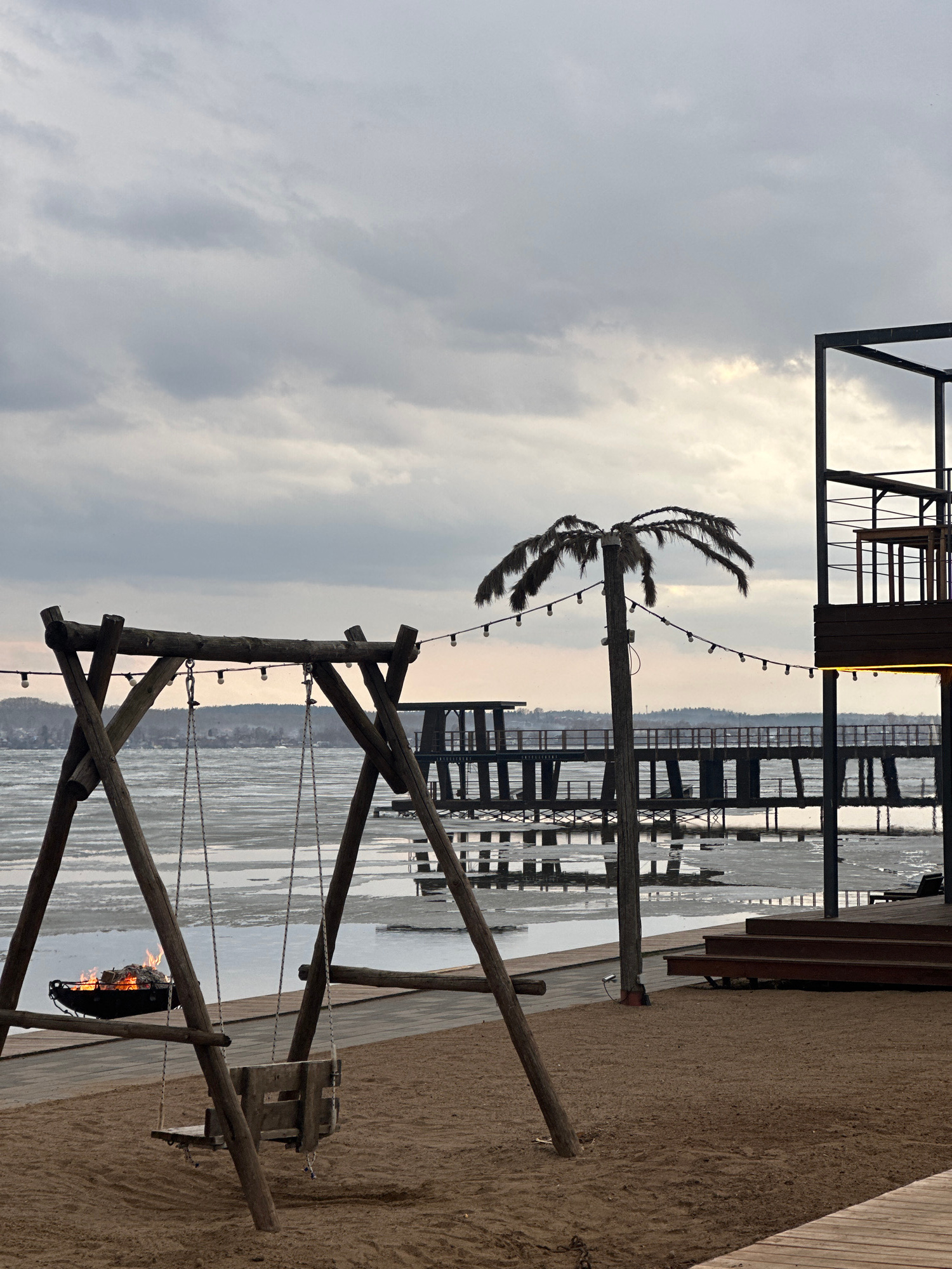 The image presents a scene at a waterside location in Votkinsk, Russia. A decorative wooden swing set stands prominently in the foreground, with a fire burning in its seat. A palm tree, adorned with s…read more