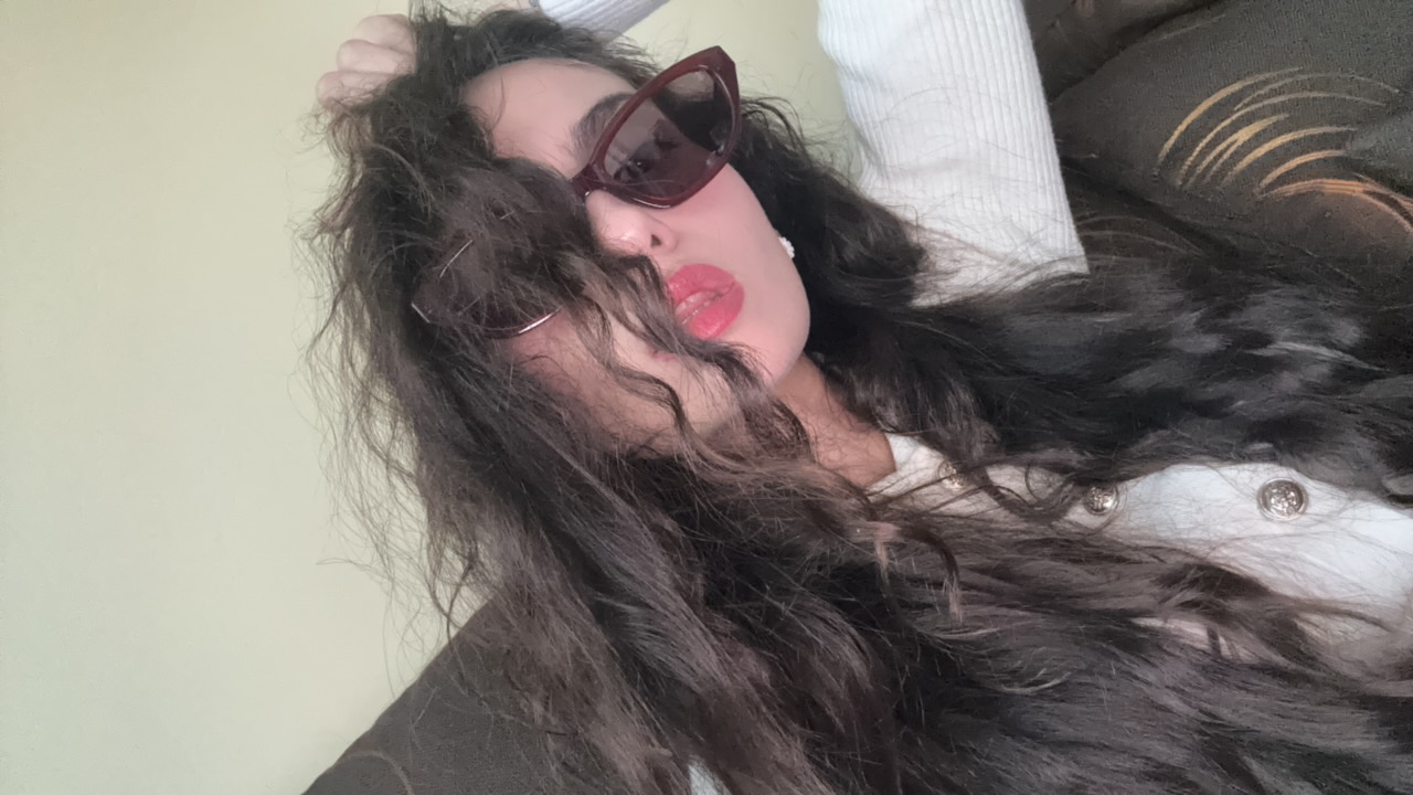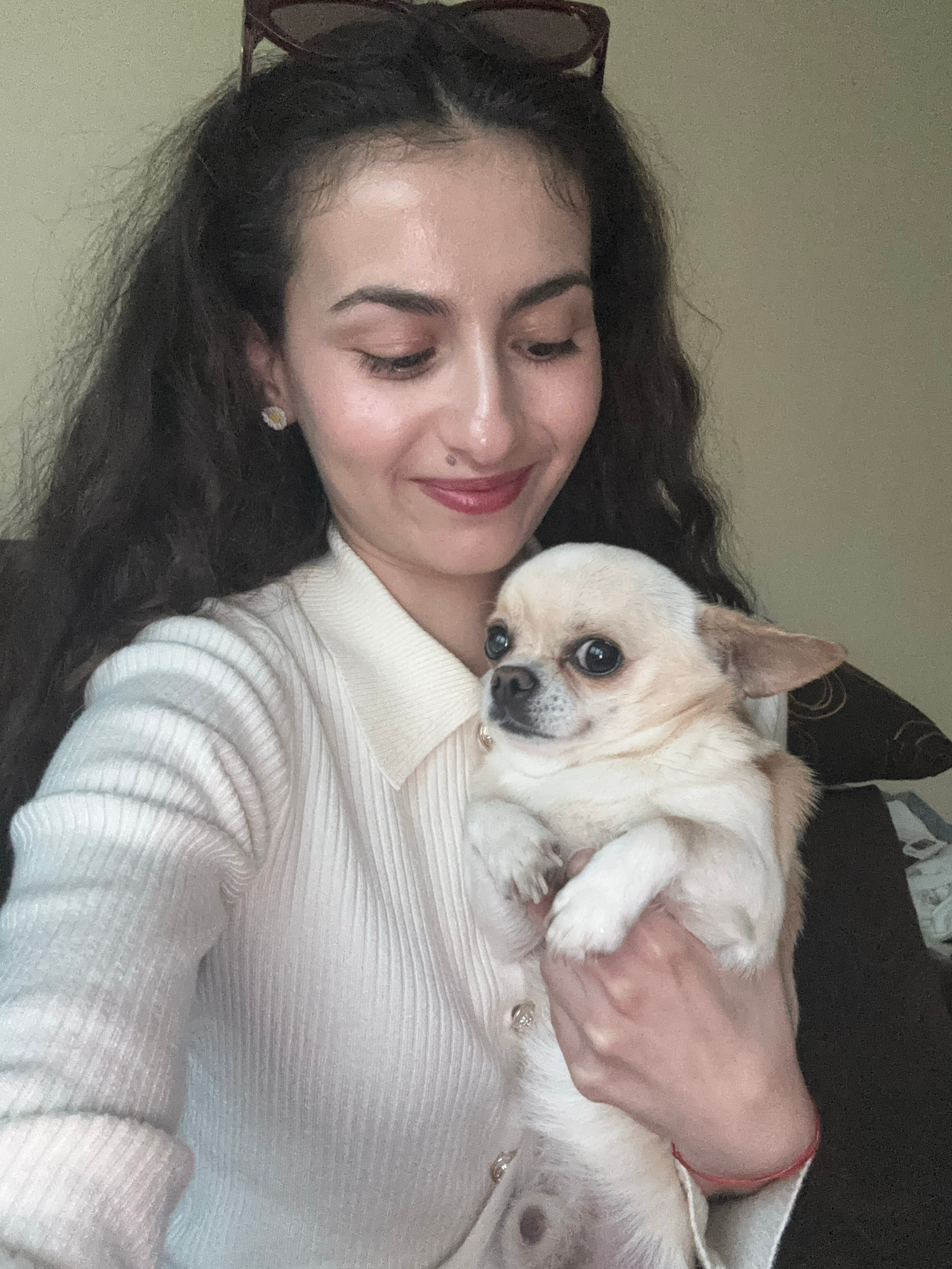 A woman is holding a light-colored chihuahua. The woman has long, dark, wavy hair and is wearing a white sweater. Sunglasses are perched on her head. Her hand is holding the dog. The location is not iā¦read more