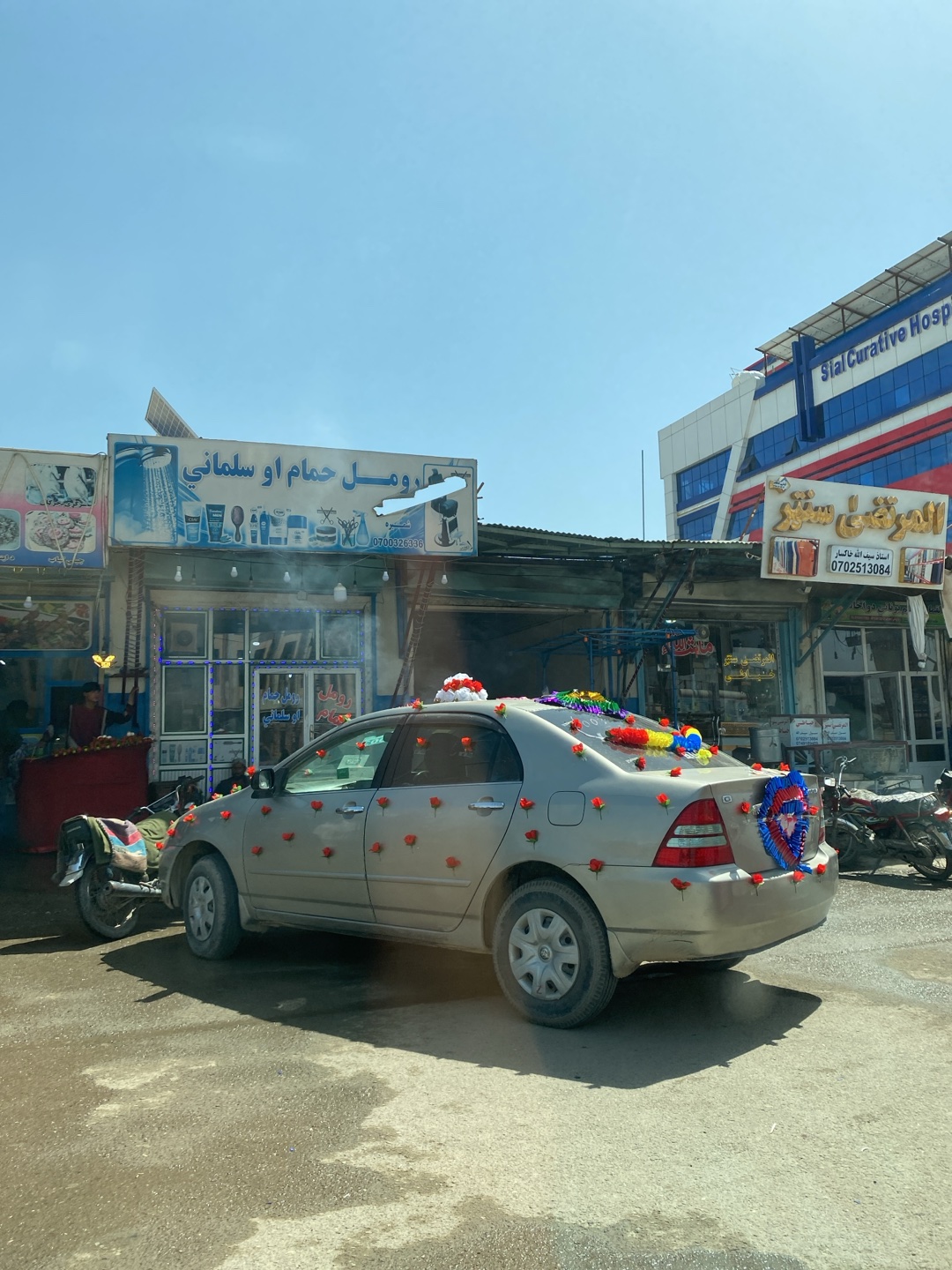 The image shows a silver car decorated with red roses and colorful garlands, parked on a street in Kandahar, Afghanistan. The car has additional decorations on the roof and rear. A motorcycle with a s…read more