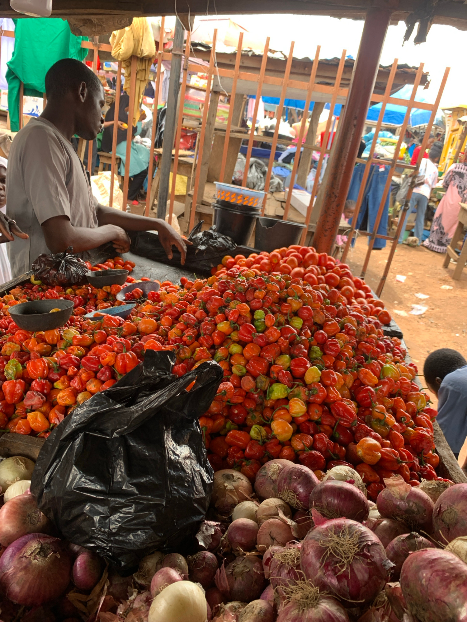 The image shows a vendor at a market in Ilorin, Nigeria, with a large display of Scotch bonnet peppers and onions. The vendor is a dark-skinned man in a light-colored shirt, looking to the left. The p…read more