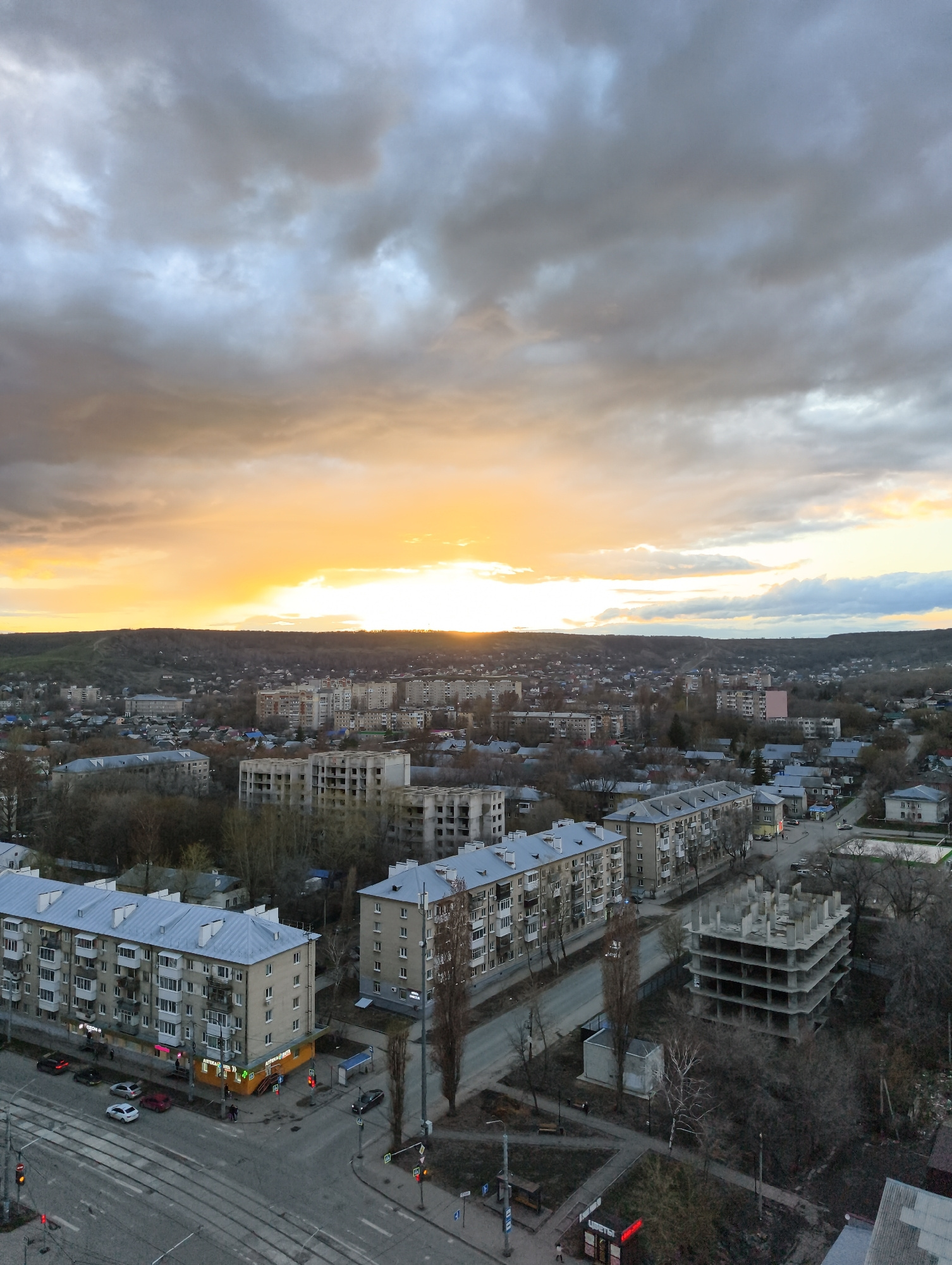The image shows an urban landscape in Saratov, Russia, under a cloudy sky with a bright sunset or sunrise on the horizon. In the foreground are residential buildings, typically Soviet-era apartment bl…read more