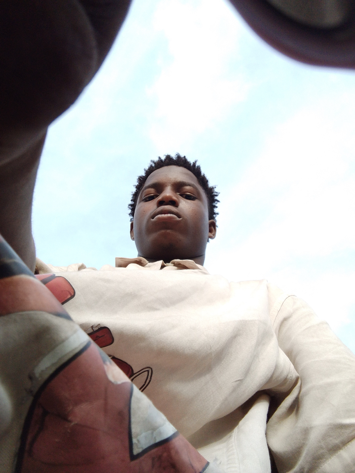 A low-angle shot shows a young man with short, dark, textured hair looking down at the camera. He has dark skin and a neutral expression. He wears a light tan collared shirt, partially obscured in the…read more