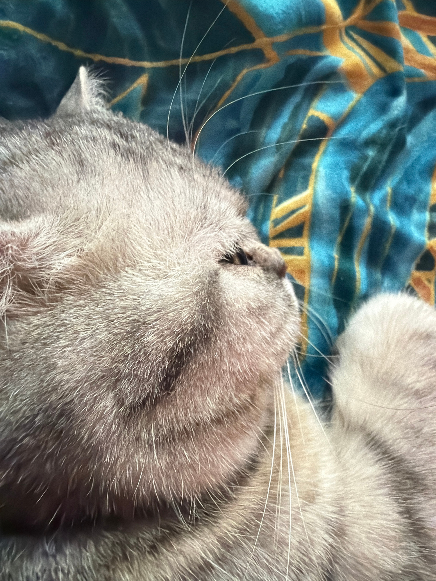 A close-up image shows a gray and white tabby cat lying on a blue and gold patterned surface. The cat's head is positioned in the lower-left corner, with its ear partially visible. Its closed eyes are…read more