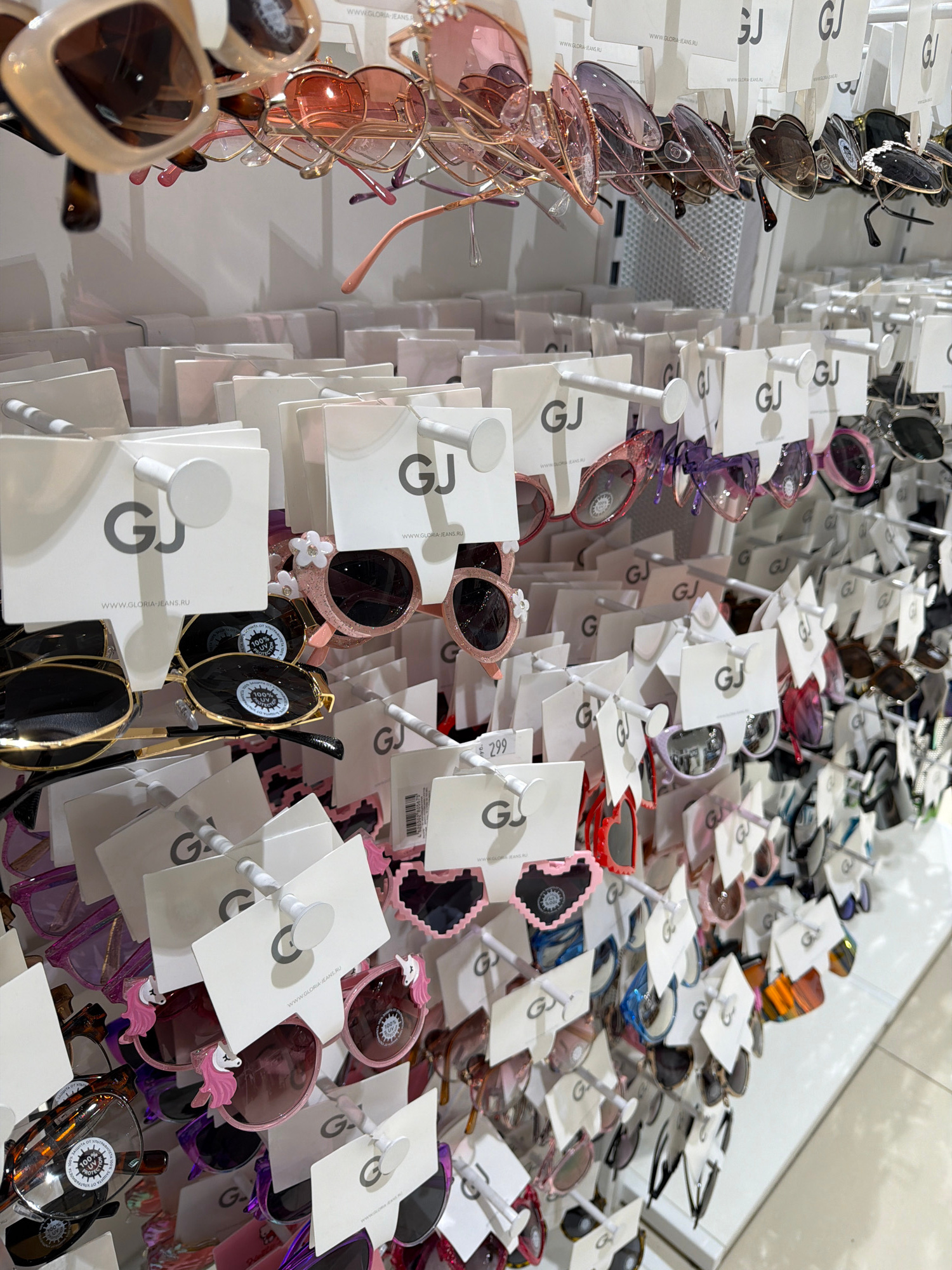 This image shows a display of sunglasses for sale. The sunglasses are arranged on a wall, each pair hanging from a white card with the logo "GJ" on it. The sunglasses come in a variety of styles and c…read more