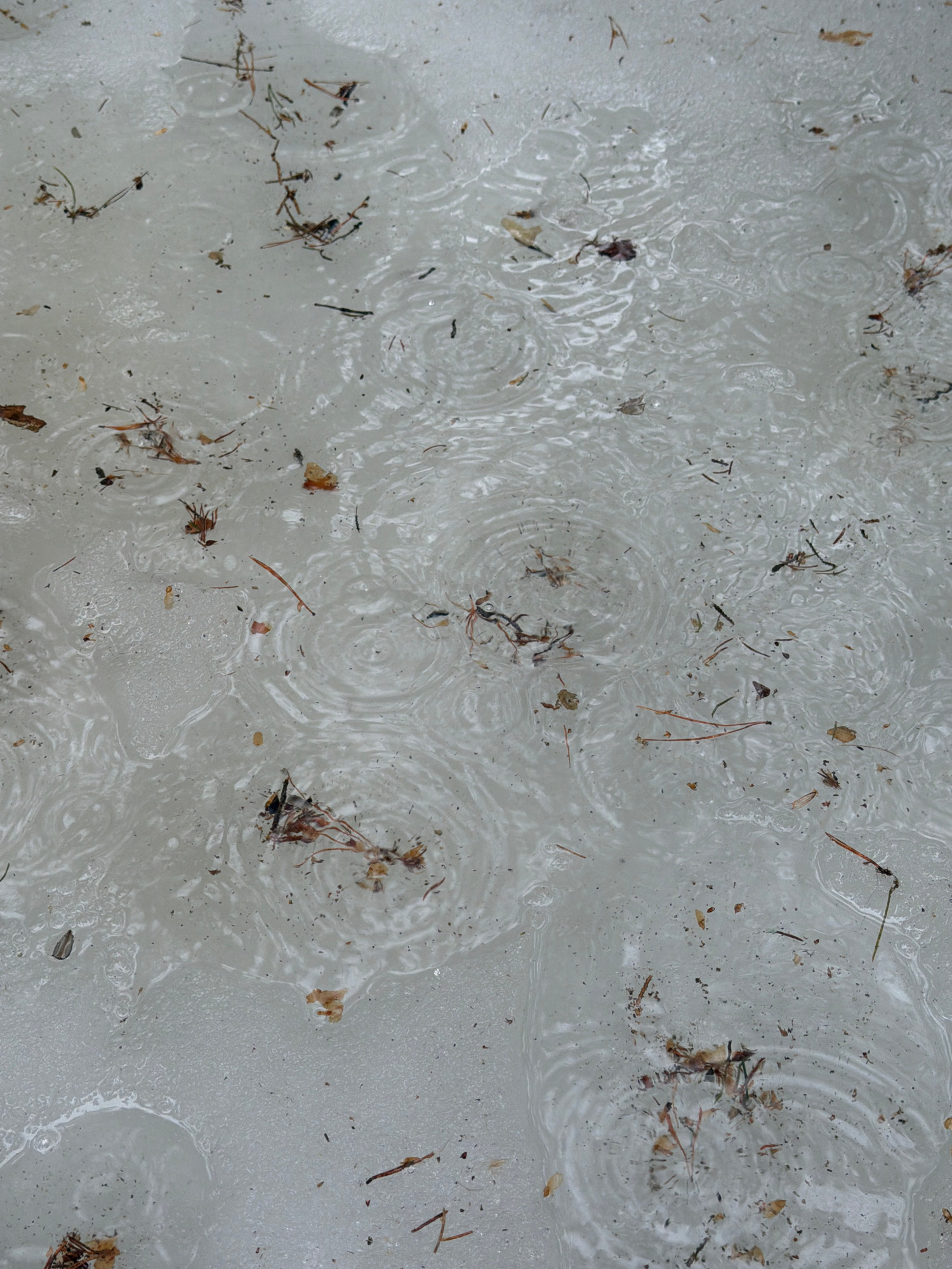 The image shows a close-up view of a puddle or a thin layer of melting ice and snow on the ground. The surface is covered with small debris such as leaves, twigs, and pine needles. There are ripples iā¦read more