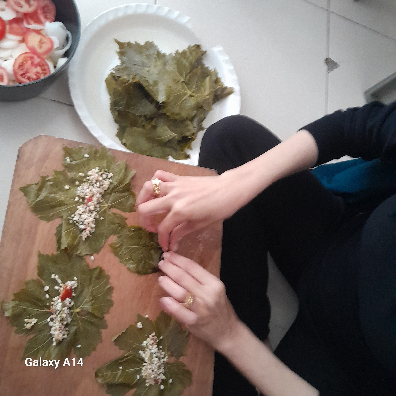 A person is sitting on the floor preparing stuffed grape leaves. The individual is wearing black clothing and has rings on their fingers. They are working on a wooden cutting board with several grape…read more