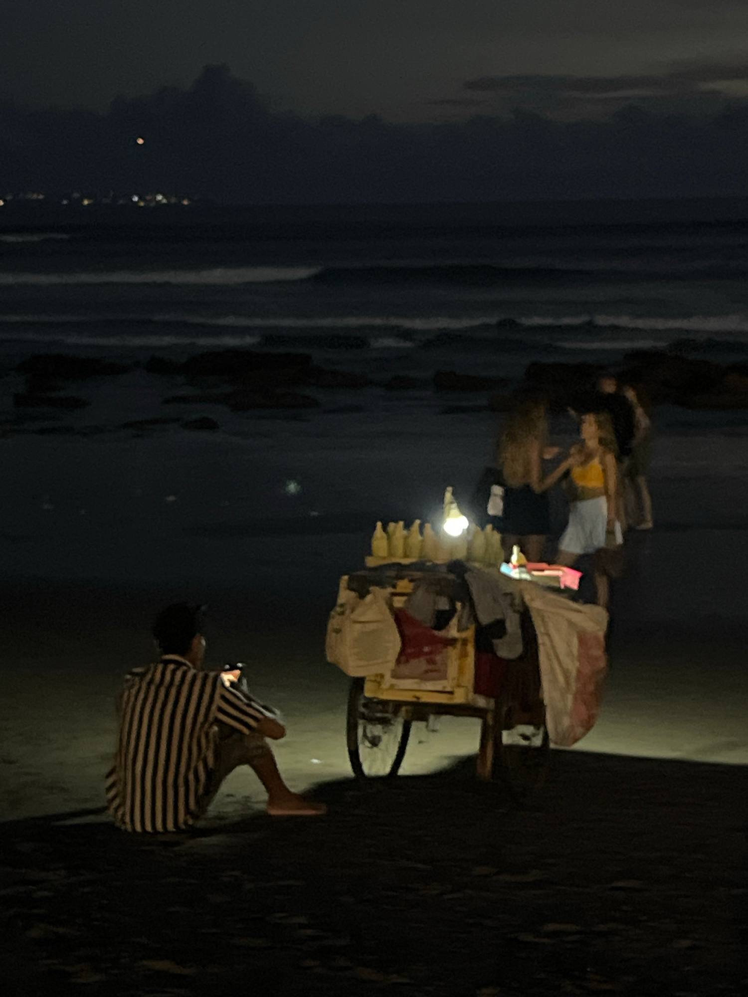 The image captures a nighttime scene on a beach in Canggu, Indonesia. In the foreground, a person wearing a striped shirt sits on the sand, looking at their phone. Nearby, there is a food cart lit by…read more