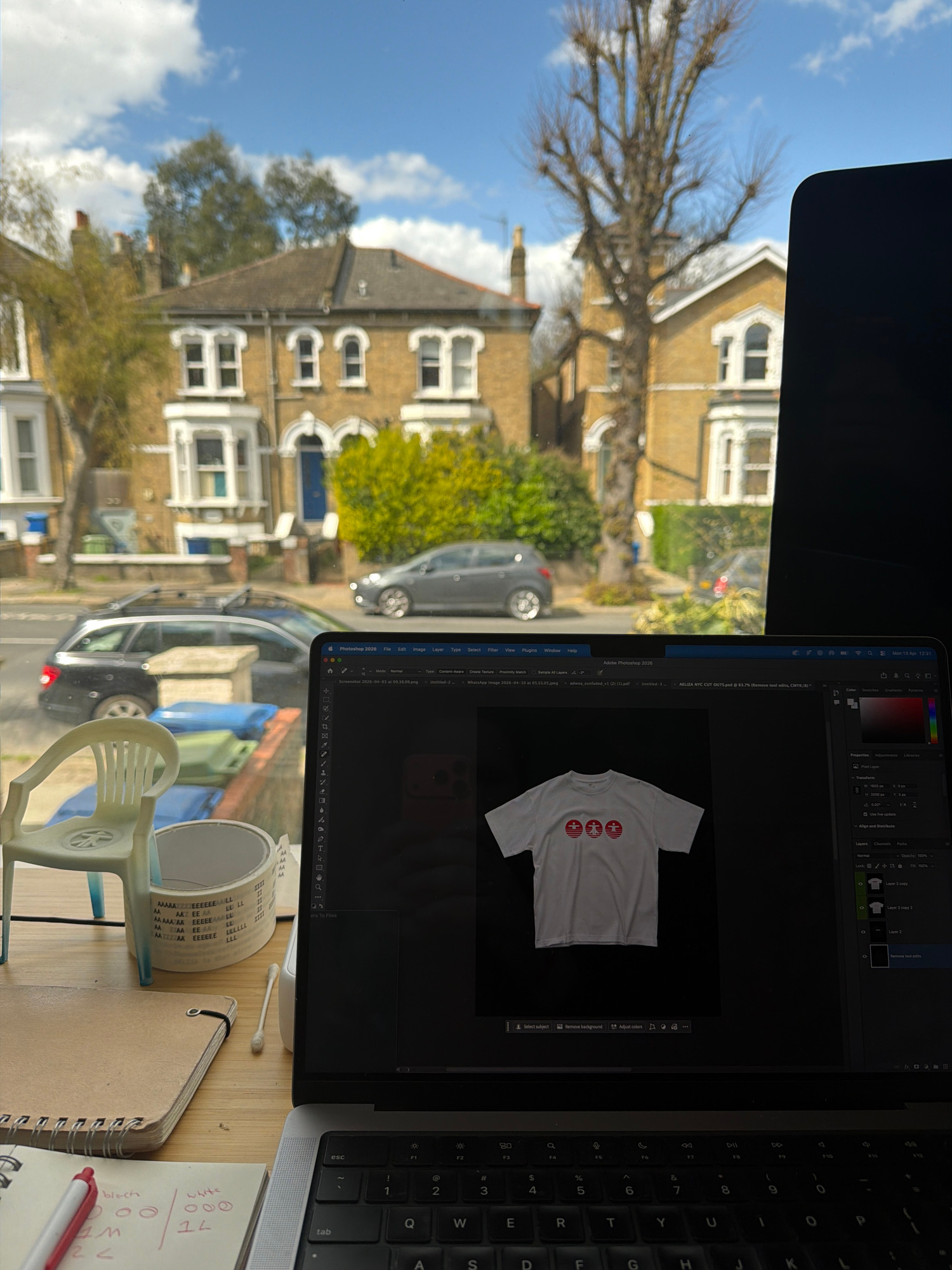 The photograph captures a view through a window in what appears to be a room. Outside the window, a street scene unfolds with rows of terraced houses, trees, and parked cars visible. The houses are co…read more