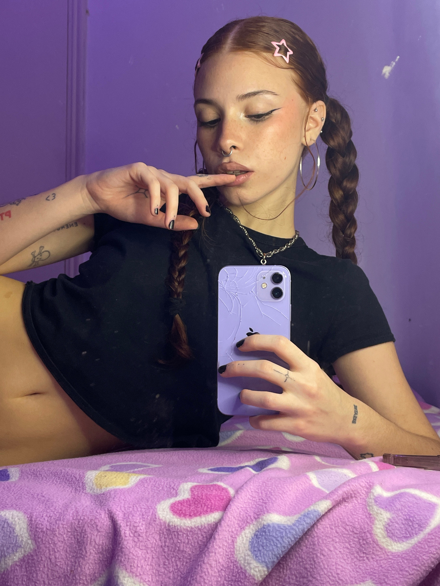 A young woman with red hair styled in pigtail braids is posing for a selfie in front of a purple wall. She is wearing a black crop top and has a silver necklace. She holds a cracked purple iPhone in h…read more