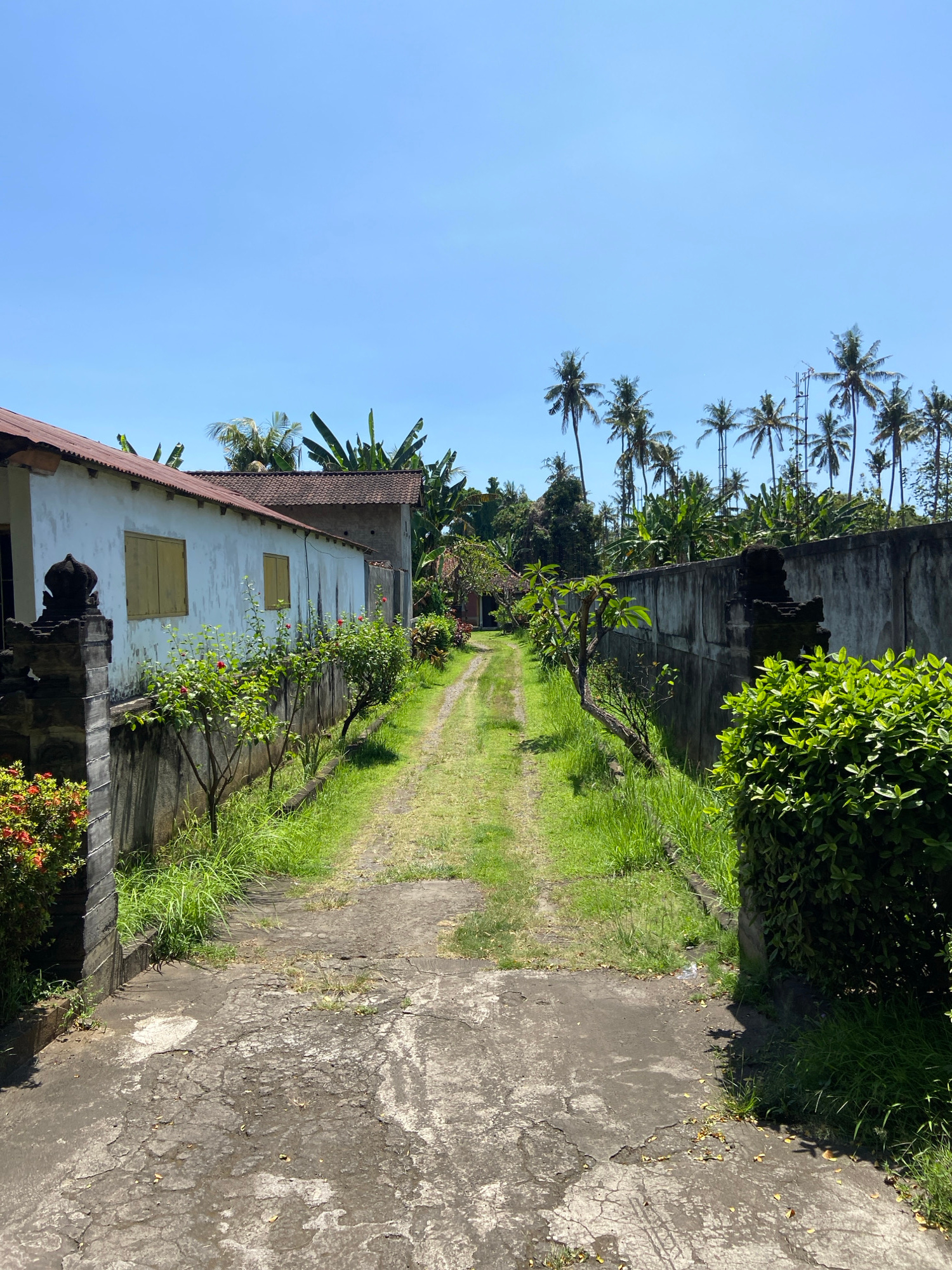 The image presents a rural scene in Buleleng, Indonesia. The sky is clear and blue. The landscape features a narrow path overgrown with grass, bisecting the scene. On the left side of the path stands…read more