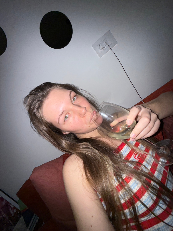 A woman is angled in the frame, holding a wine glass to her lips as if drinking. She has fair skin, light brown hair, and green eyes. She wears a red, white, and blue striped shirt. Her arm rests on a…read more