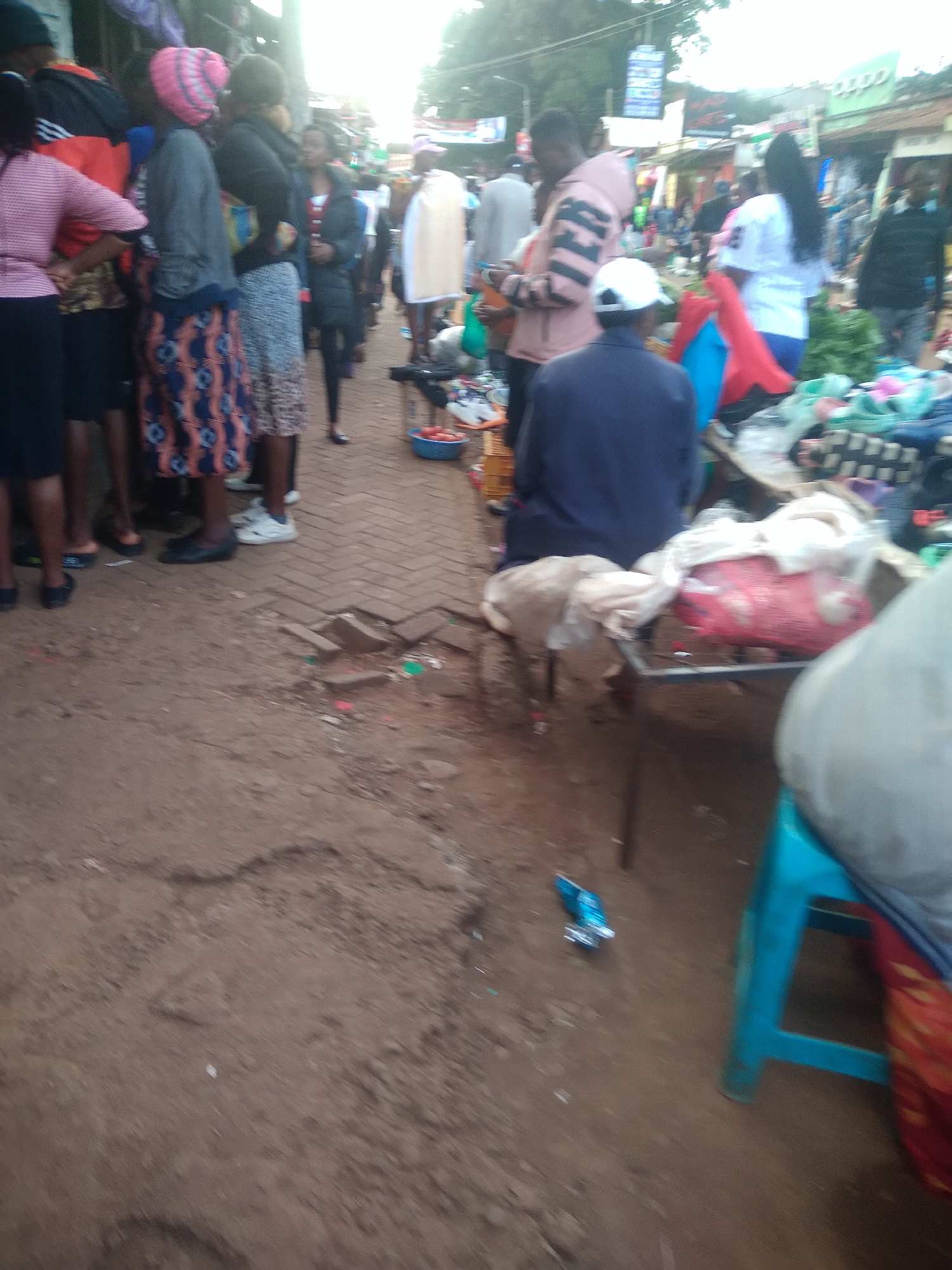 In Nyeri, Kenya, a blurry, ground-level, outdoor shot reveals a row of people standing in a line on a brick pathway or road edge. These individuals are presumably shopping at an outdoor market. The ma…read more
