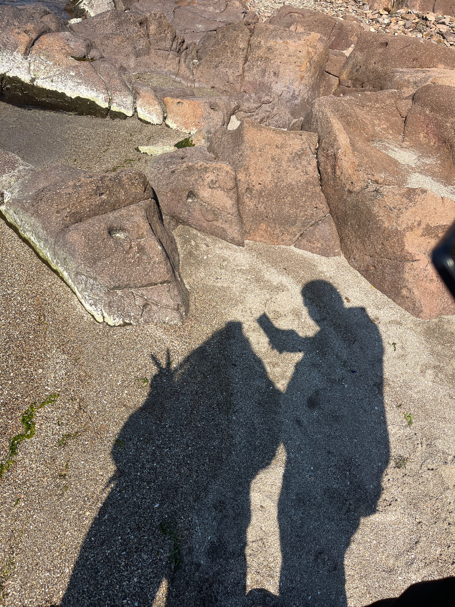 The image shows a rocky area next to what appears to be a beach or sandy ground. There are several large rocks on the left, with smaller pebbles visible near the top. To the right of the rocks is a sa…read more