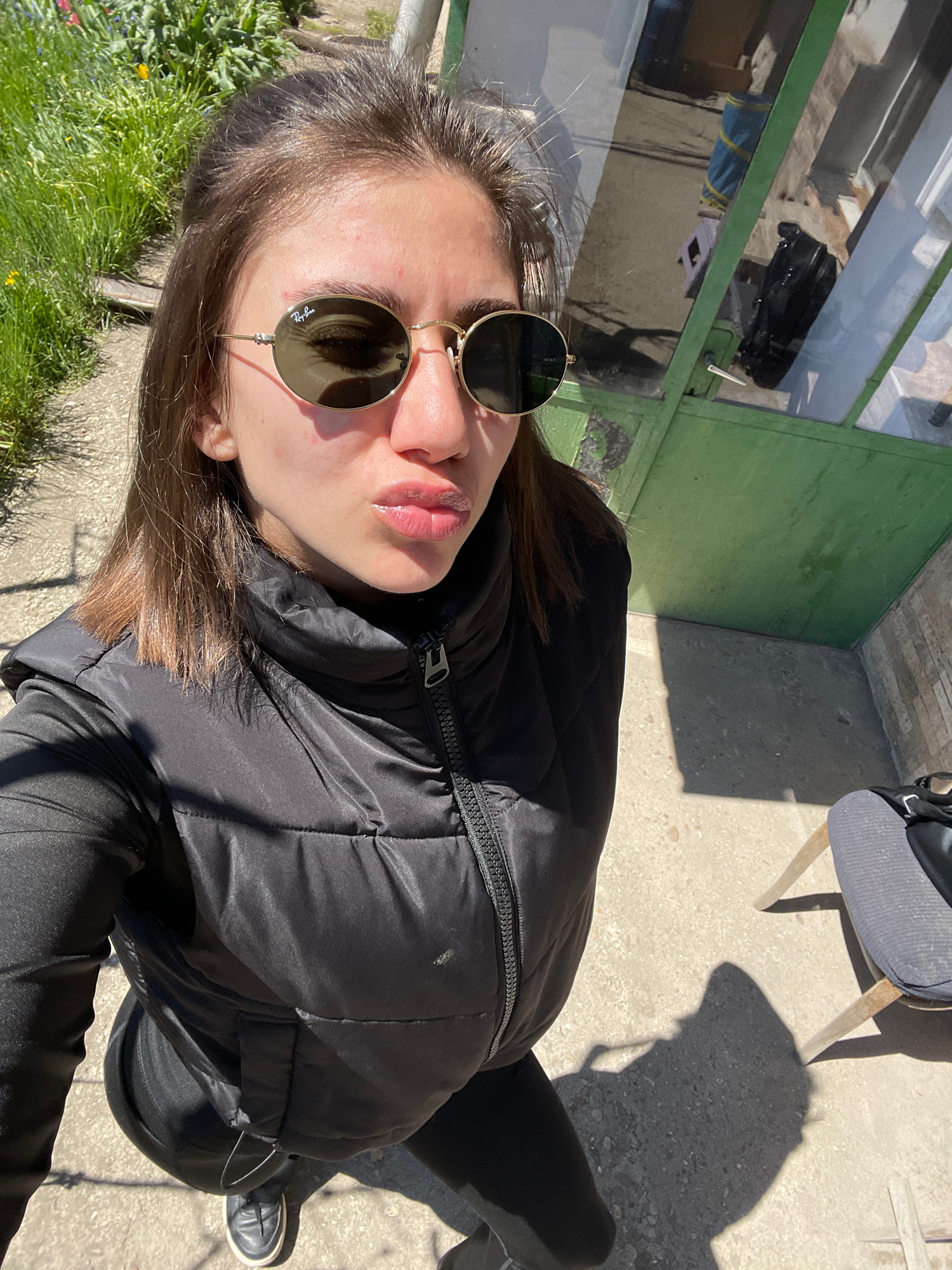 A selfie-style photo shows a person wearing sunglasses and a black puffer jacket. The photo is taken from a high angle, looking down at the person. The background includes a building with a green pain…read more
