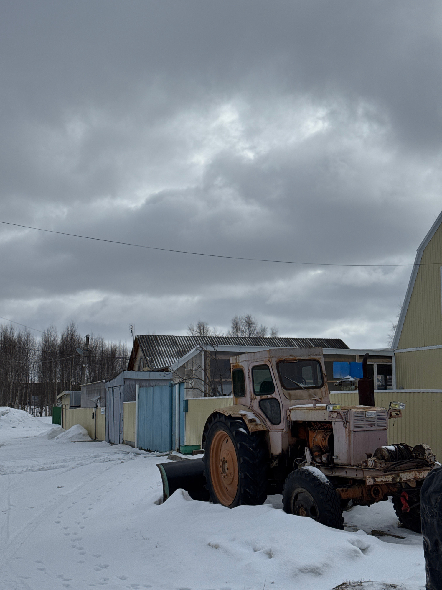 An old, rusty, cream-colored tractor sits partially buried in a snowbank next to a row of weathered, single-story buildings in Vysokiy, Russia. The sky is heavily overcast. Power lines are visible aga…read more