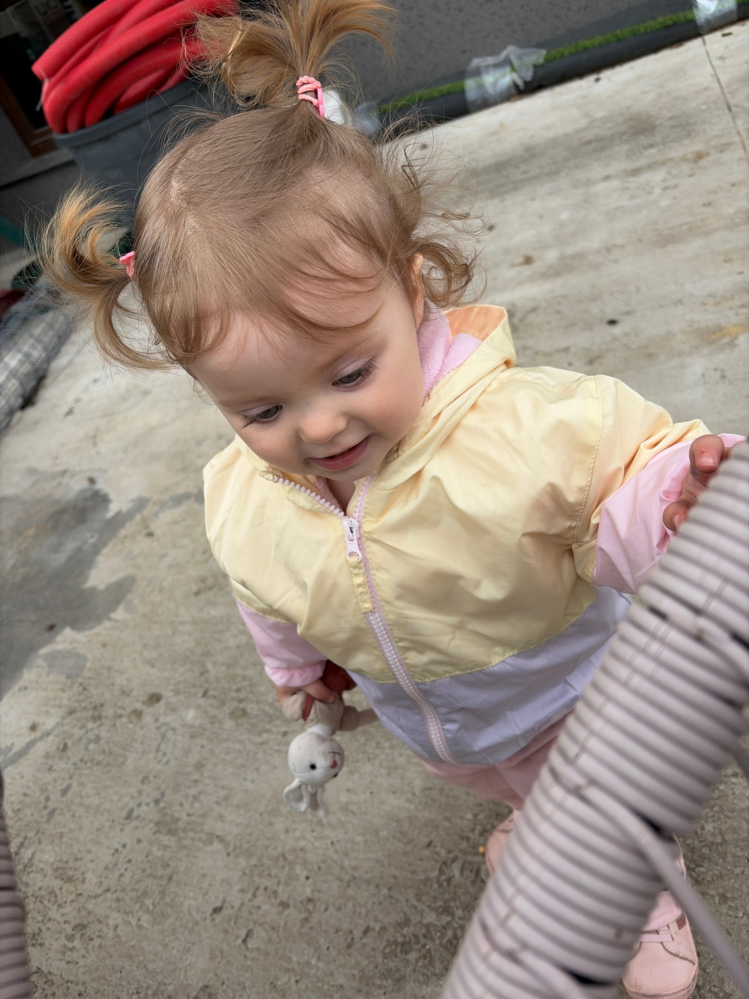 The image features a happy toddler captured from an overhead perspective, looking up at the camera with a gentle smile. The child has light blonde or light brown hair styled in two pigtails secured wi…read more