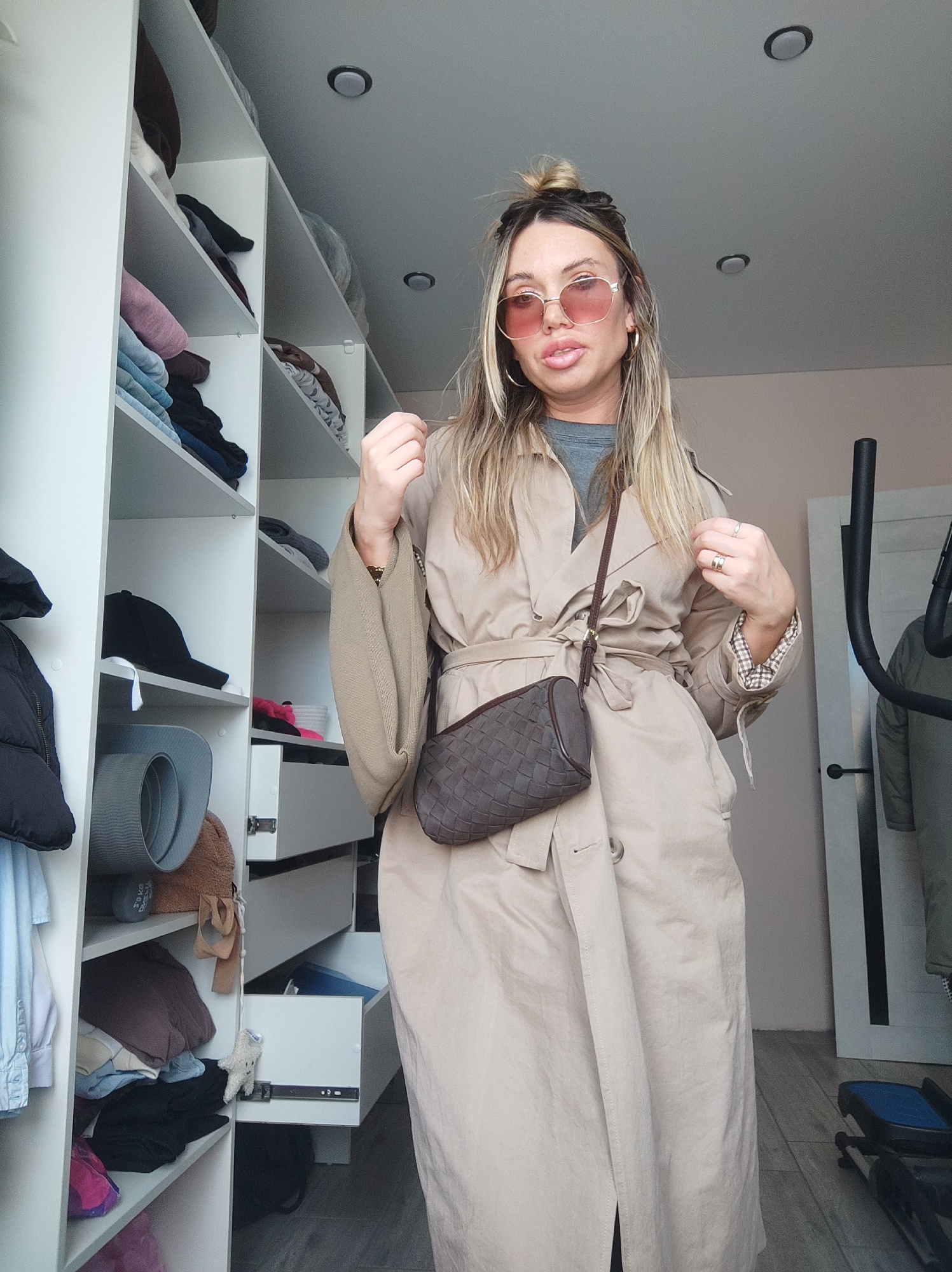 The image displays an adult female standing within what appears to be a domestic interior, likely a bedroom or dressing room. The woman, with blonde hair partially styled in a bun, wears pink-tinted,…read more