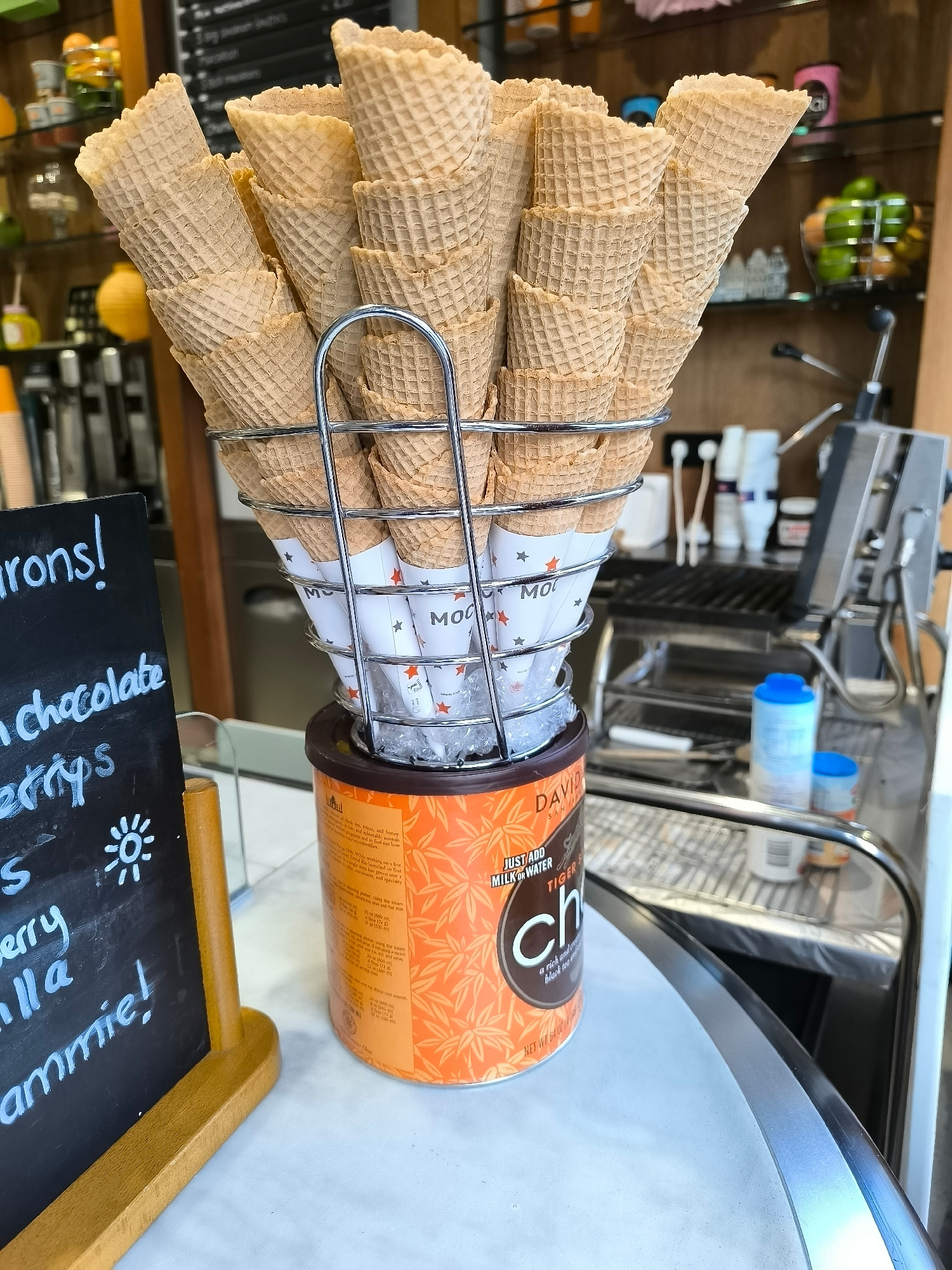 The image shows a stack of ice cream cones in a metal holder, sitting on top of a DAVIDsTEA Tiger Spice Chai tin. The cones are arranged in a pyramid shape and each is wrapped with a paper wrapper wit…read more