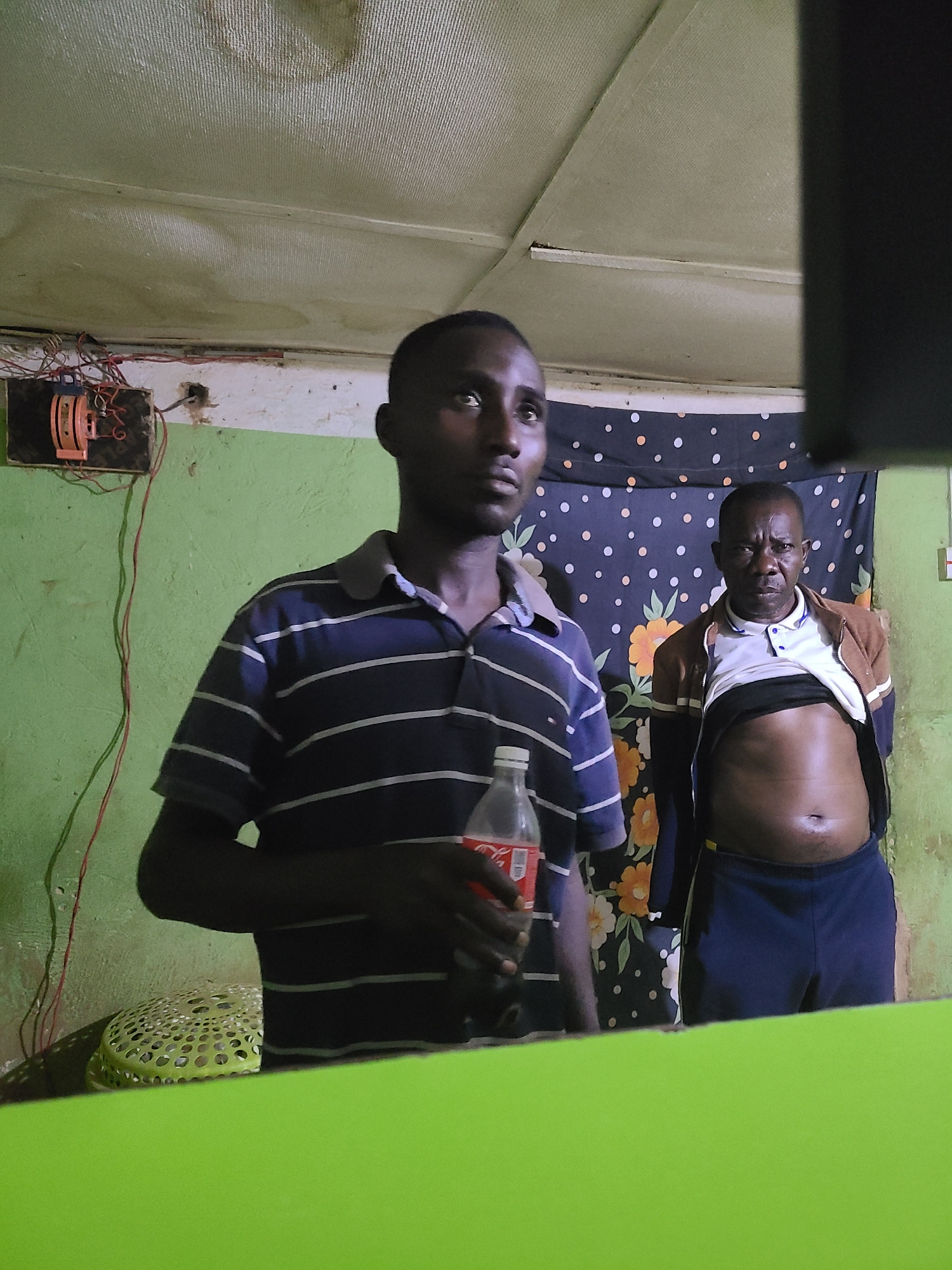 The image appears to be taken inside a room in Jos, Nigeria. Two men are present. One man is lying on a bed covered with a black and white polka-dotted sheet with orange floral patterns. He is partial…read more