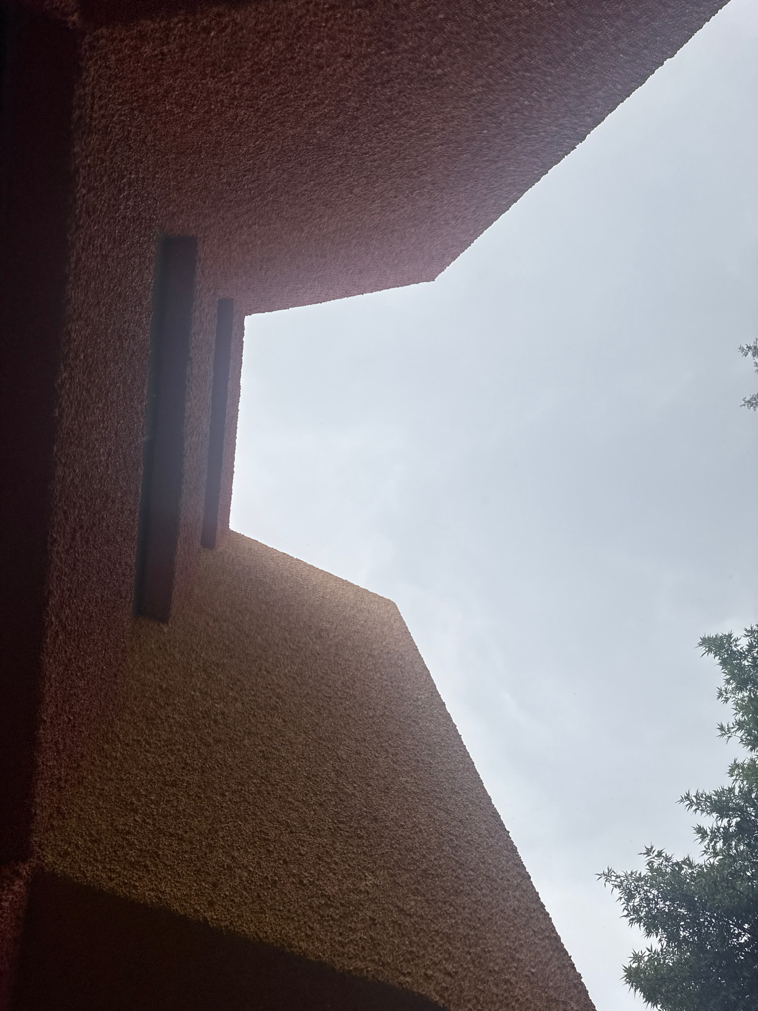 The image shows a low-angle view of two brown textured walls converging towards a bright, overcast sky. Tree branches are visible in the upper corners of the frame. The walls appear to be part of a bu…read more