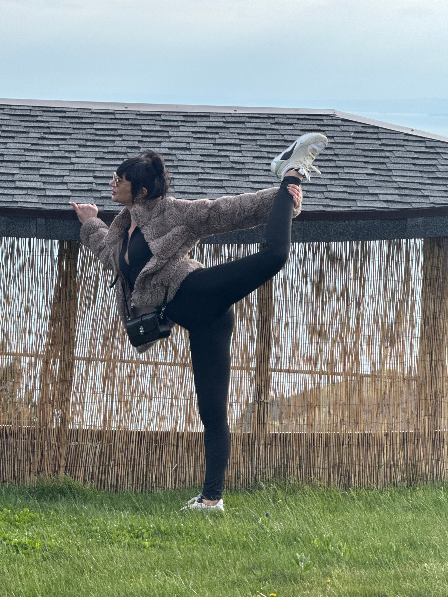 A woman in black leggings, a tan furry jacket, and white sneakers is doing a split. She has a black crossbody bag. She is outside next to a building with gray shingles and a bamboo fence, near grass.…read more