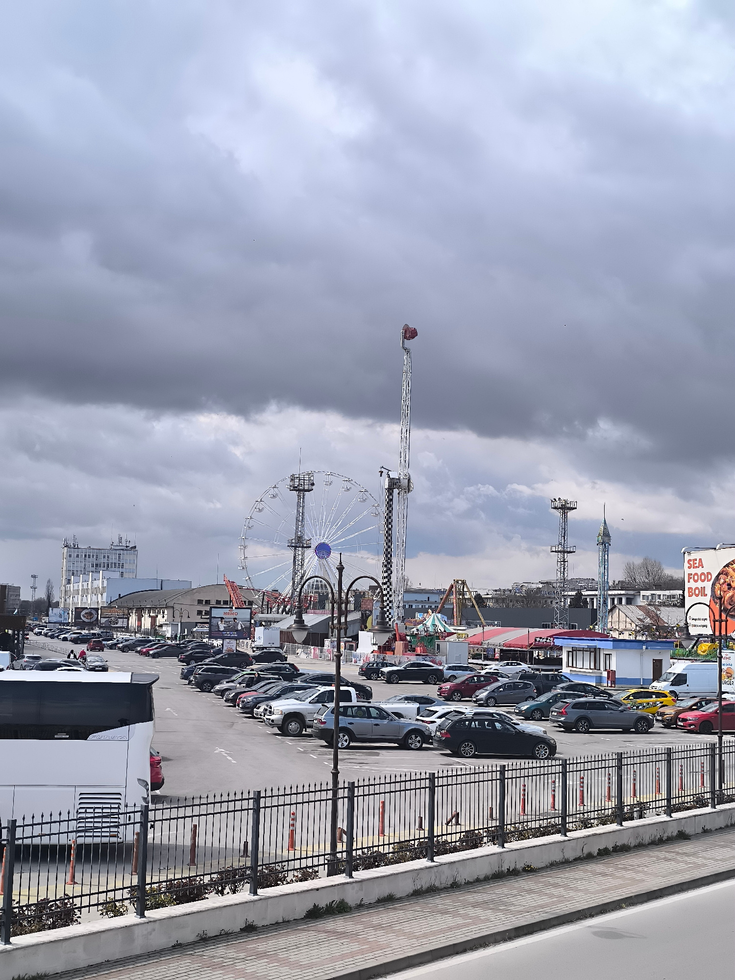 The image depicts a parking lot adjacent to an amusement park under a cloudy sky. Numerous cars are parked in an organized fashion within the lot, bordered by a black iron fence along the foreground.…read more