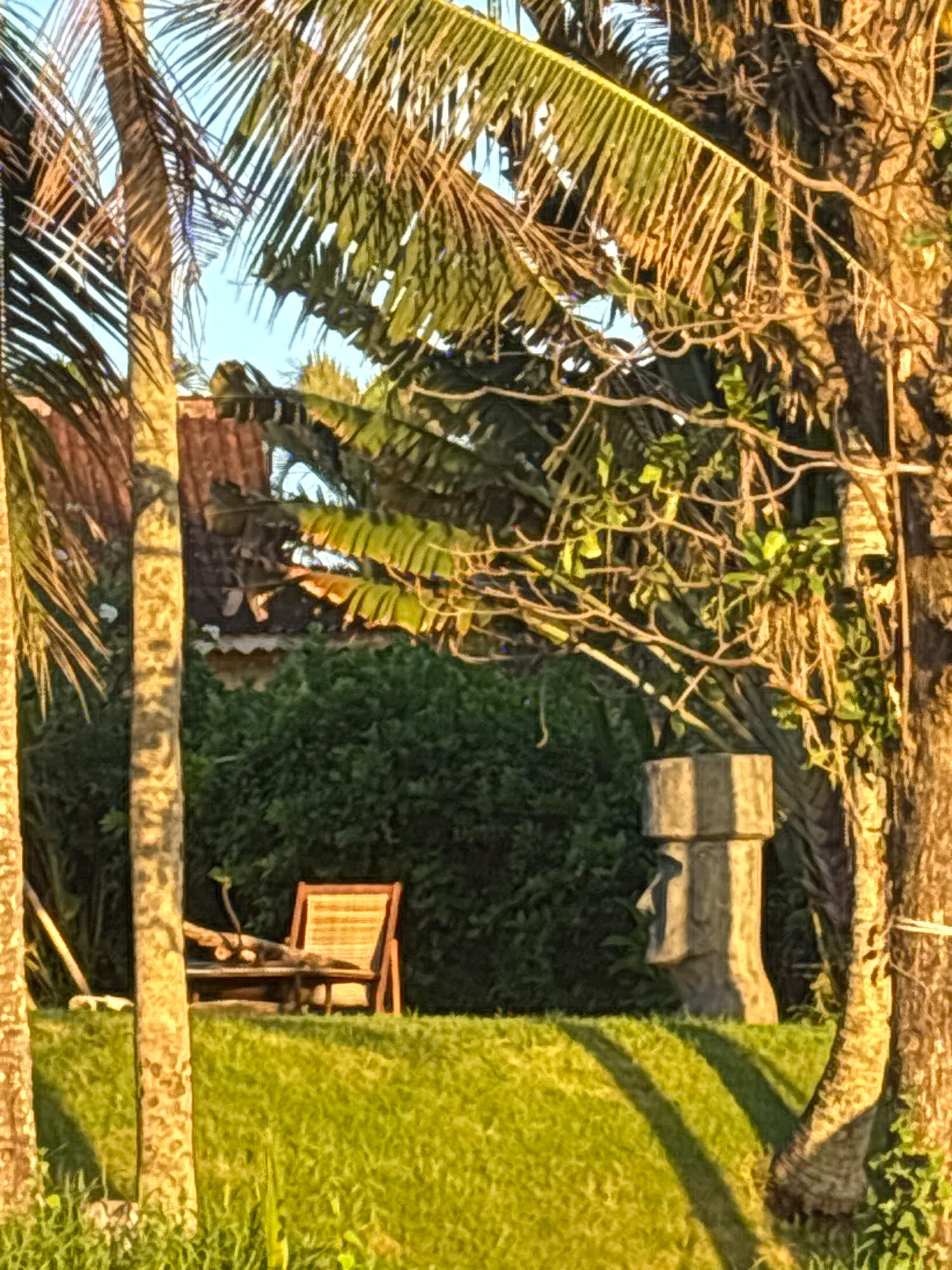 This media file captures a lush, verdant outdoor scene, likely a garden or property in a tropical setting. The image, though presented rotated in the original, depicts a dynamic composition of natural…read more