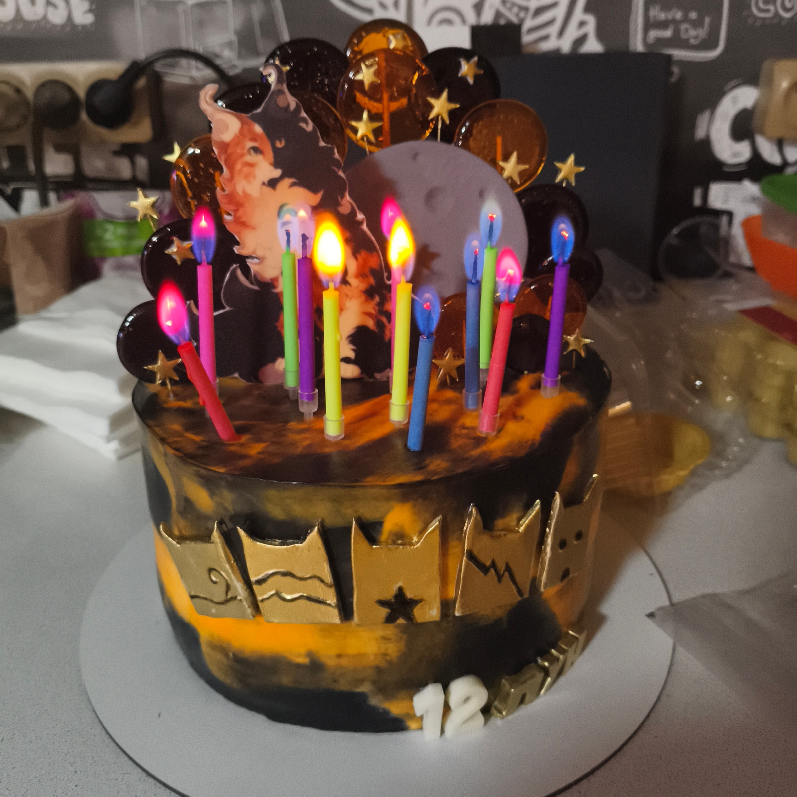 The image shows a decorated birthday cake with 12 lit candles on a white round base. The cake has a black and orange marbled frosting. Gold decorations adorn the cake including cat crown images and th…read more