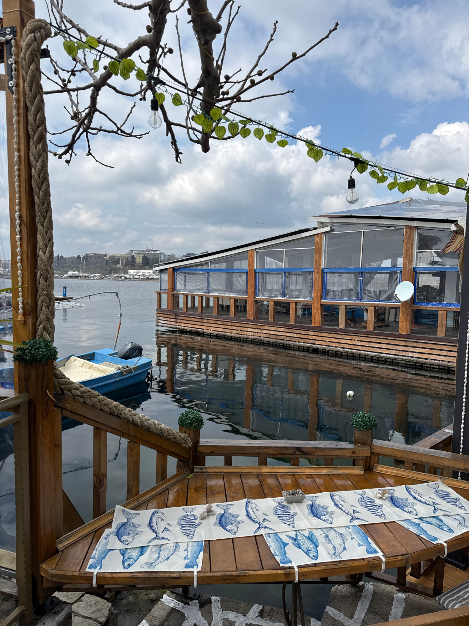 The image depicts a lakeside setting, likely in Nesebar, Bulgaria. In the foreground, a wooden structure with rope details supports a table decorated with a blue and white fish-patterned runner. A leaβ¦read more