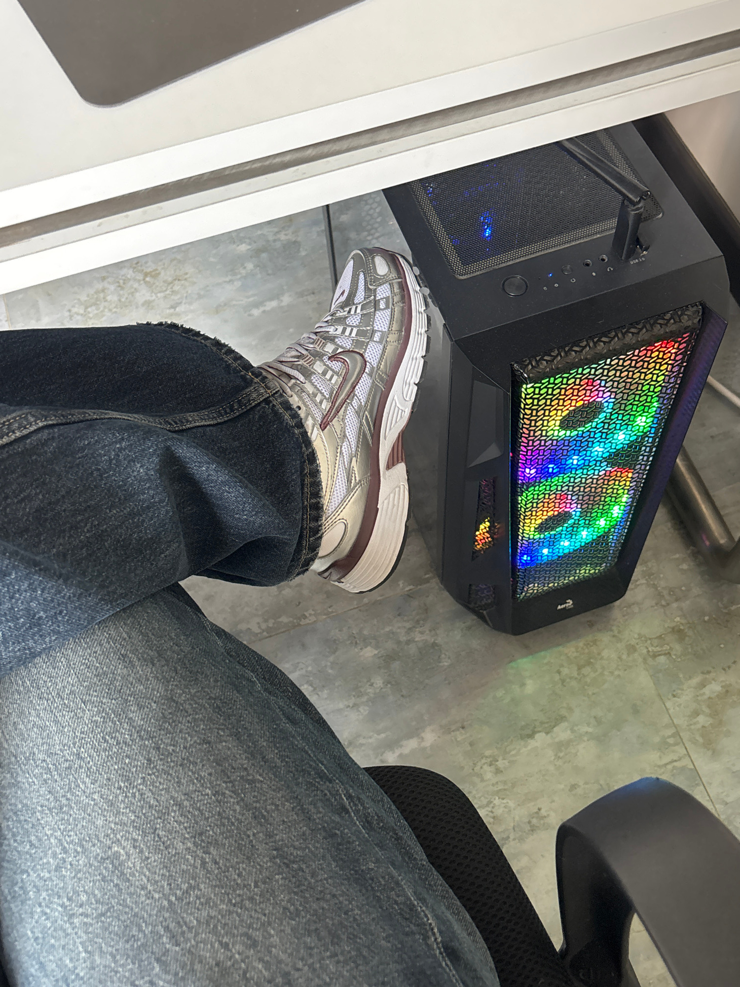 The image shows a person sitting at a desk, with a computer tower placed on the floor next to their leg. The person is wearing blue jeans and silver Nike sneakers with a maroon stripe. The computer to…read more