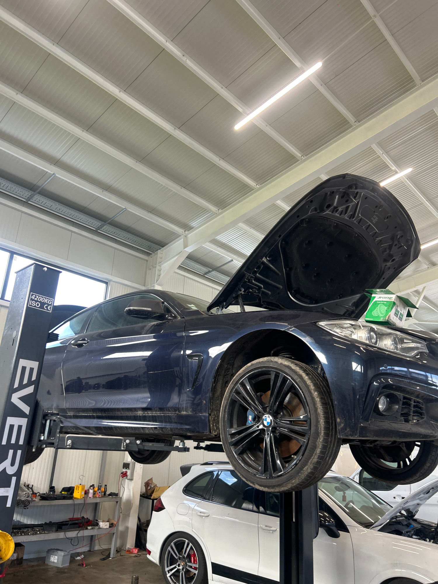 A blue BMW is elevated on a car lift in a well-lit garage. The car's hood is open, revealing the engine compartment. Next to the BMW, another white car is partially visible. The garage has a white cor…read more