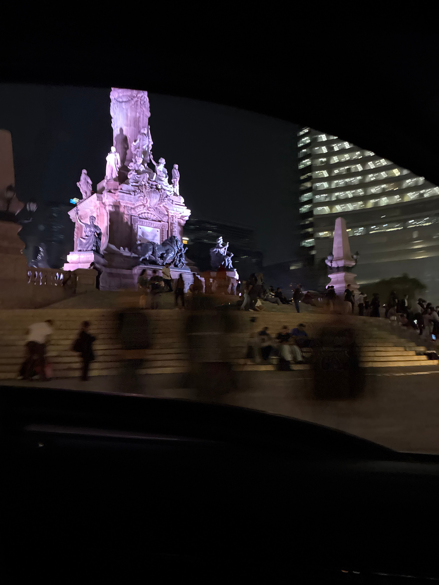 The image, taken at night, captures a vibrant urban scene featuring a large, illuminated monument and a modern high-rise building, viewed from inside a vehicle. The central subject is an ornate, clas…read more