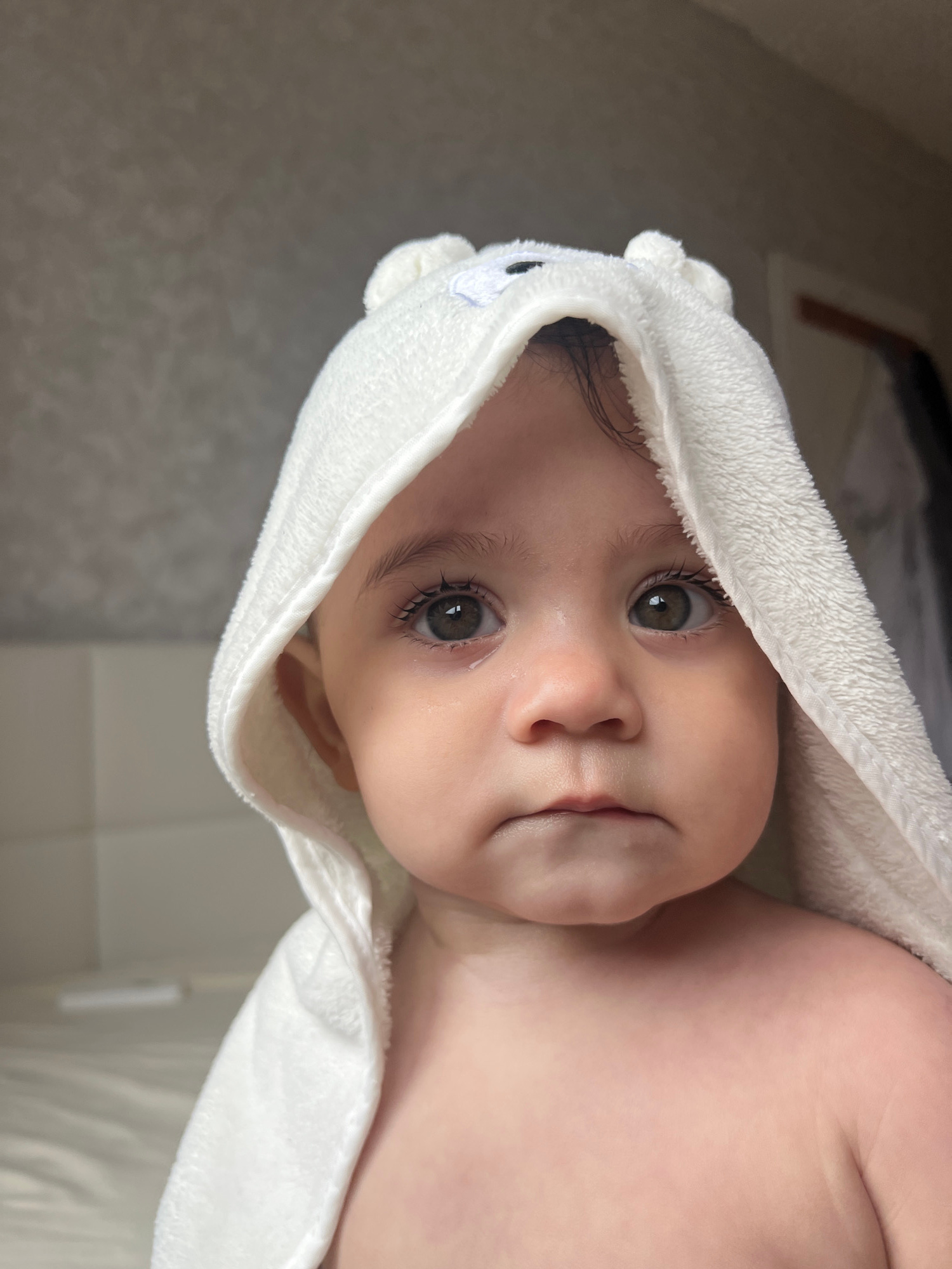A close-up, medium shot depicts a baby wrapped in a white, hooded towel. The baby's face is the central focus, featuring wide, brown eyes, a small nose, and slightly pursed lips. The towel's hood has…read more