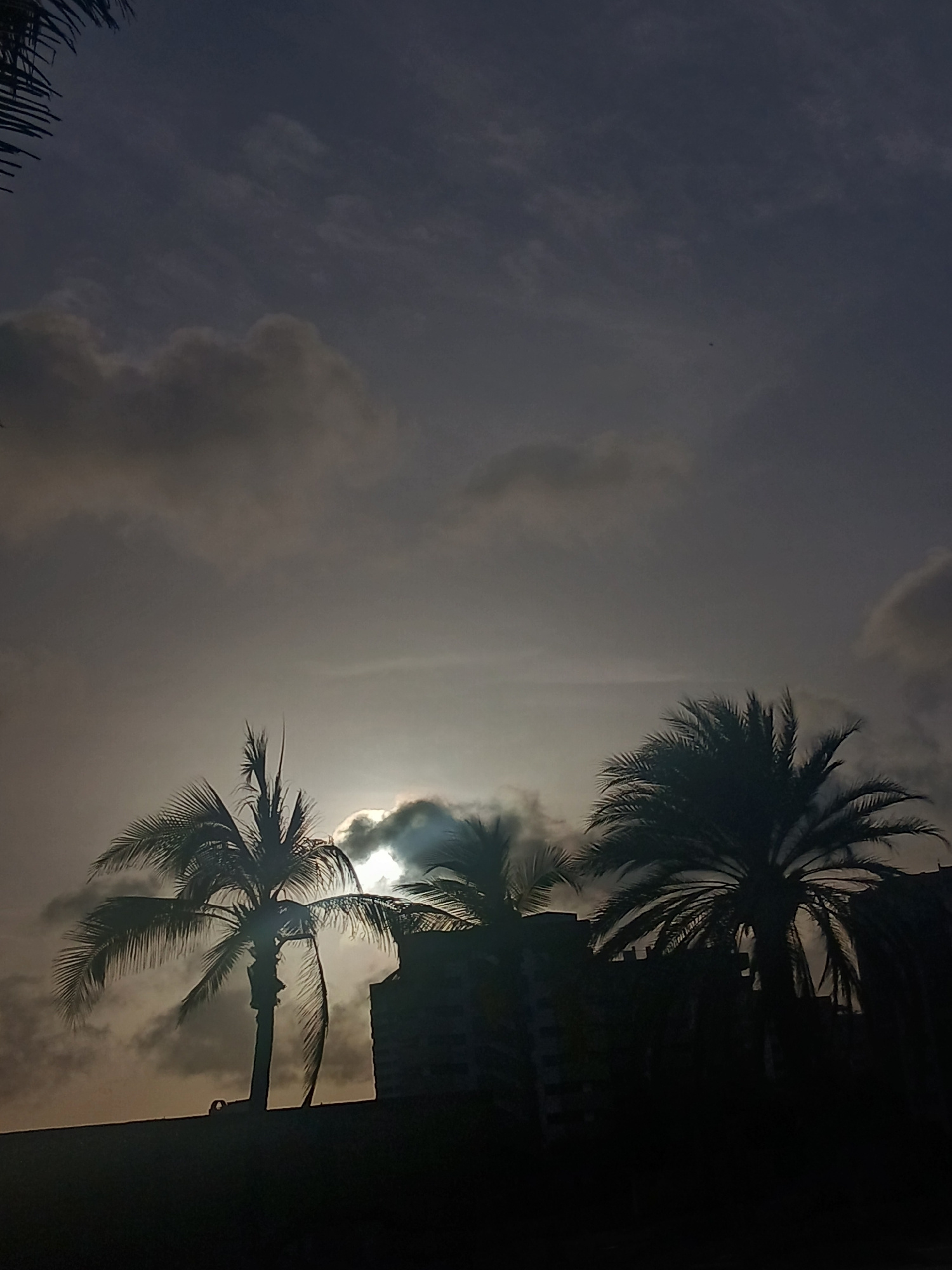 The image depicts a view in Porlamar, Venezuela, featuring silhouettes of palm trees against a cloudy, overcast sky with the sun partially obscured. The trees are silhouetted due to the backlighting o…read more