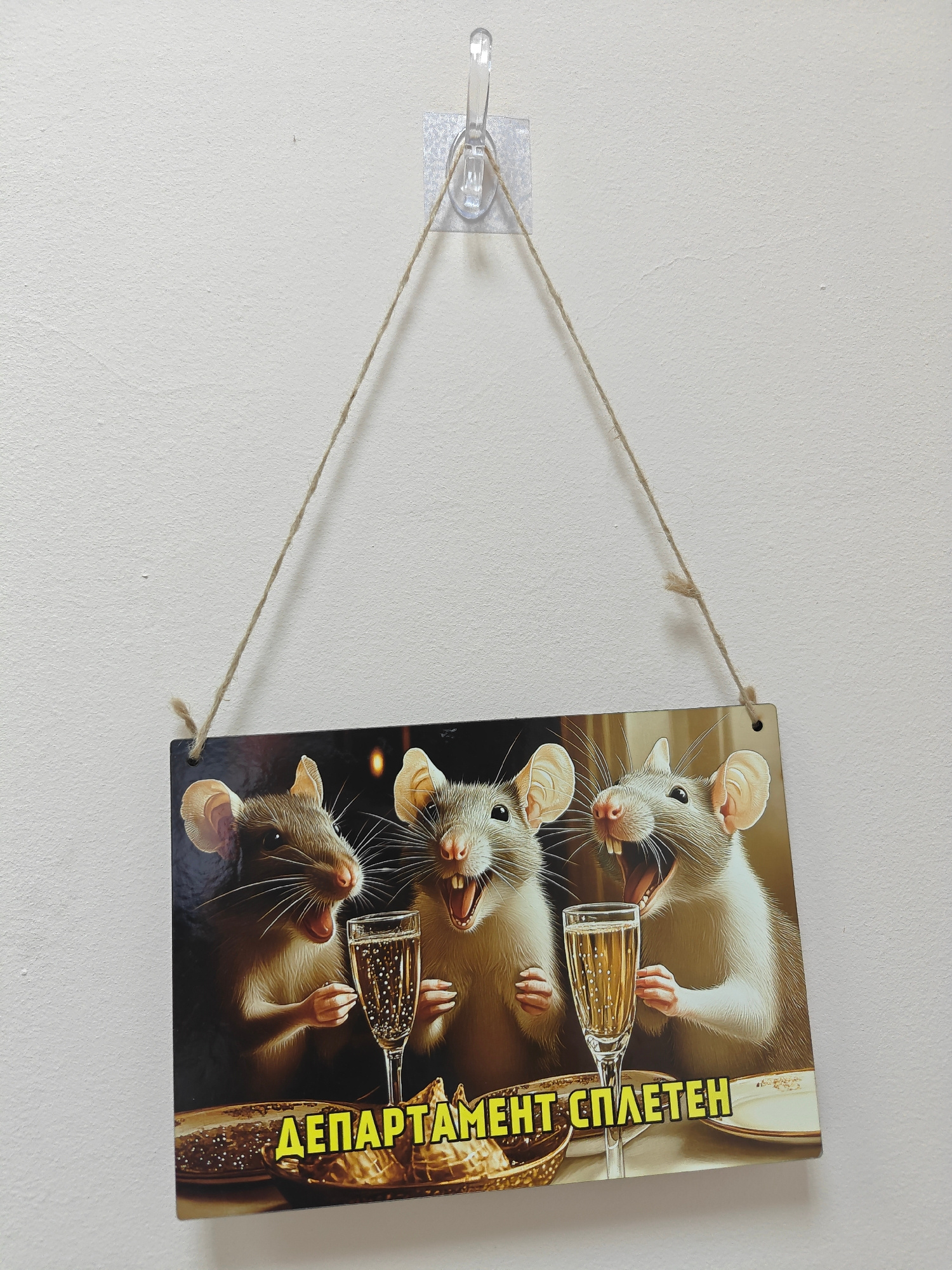 A rectangular sign hangs on a white wall from a clear plastic hook. The sign is suspended by a natural twine rope. The sign depicts three anthropomorphic rats sitting at a table with champagne flutes…read more