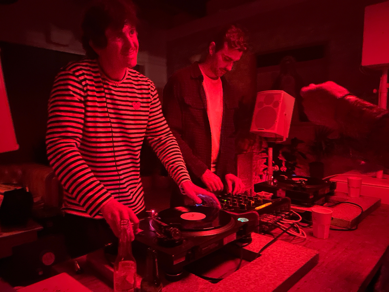 Two DJs are performing in a dimly lit, possibly indoor venue. The lighting is predominantly red. The DJ on the left wears a black and white striped shirt with a small heart emblem. The DJ on the right…read more