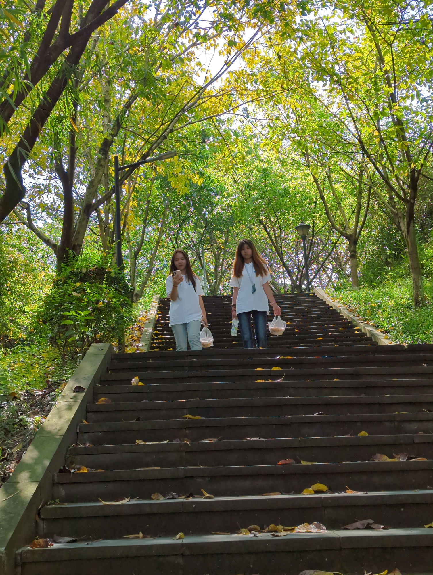 Two women are on a set of stairs flanked by green trees in Jiangjin, China. Both women have long brown hair and wear white shirts. The first woman is wearing dark pants and holding a plastic bag and a…read more