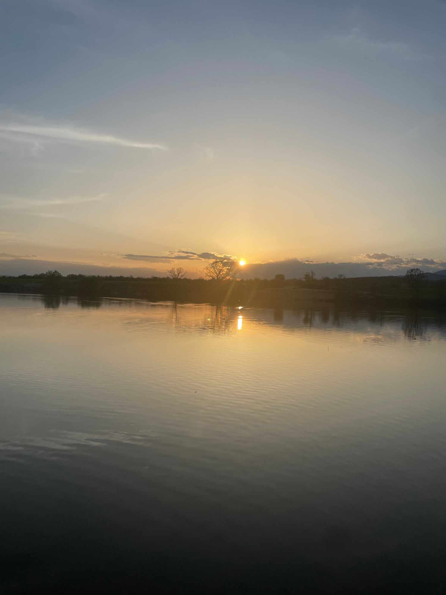 The image captures a serene sunset reflected in a body of water, likely a lake or pond. The sun is positioned near the horizon, partially obscured by trees or vegetation along the shoreline. The sky d…read more