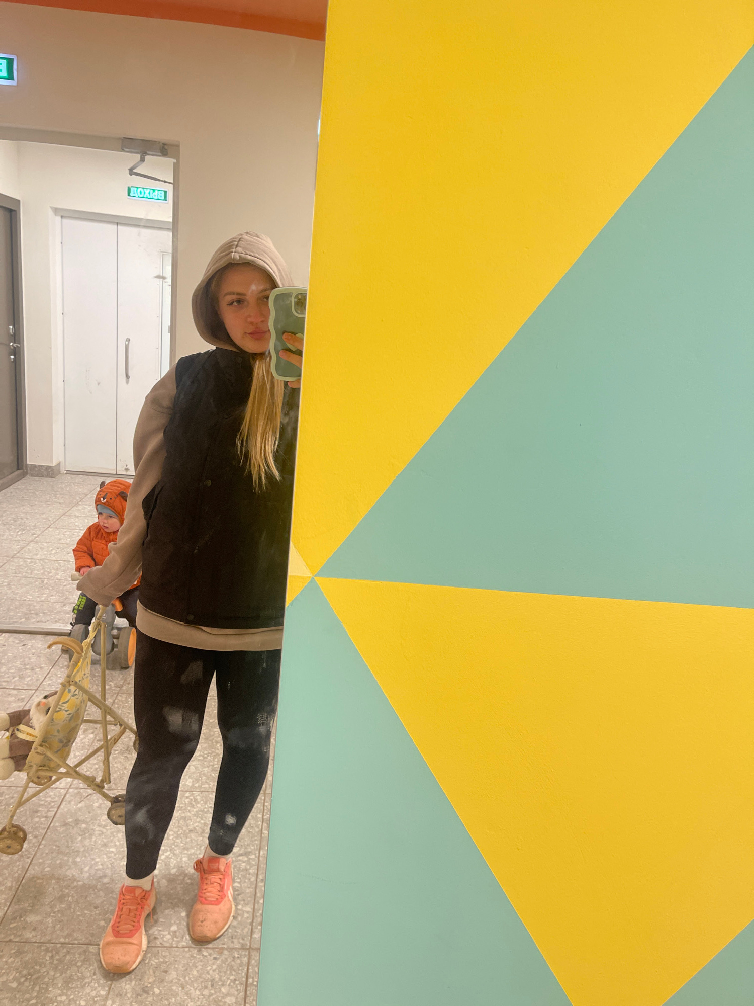 A young woman in a tan hoodie, black jacket, and black leggings stands in what appears to be a hallway, taking a mirror selfie with her smartphone. She has blonde hair and is wearing pink athletic sho…read more