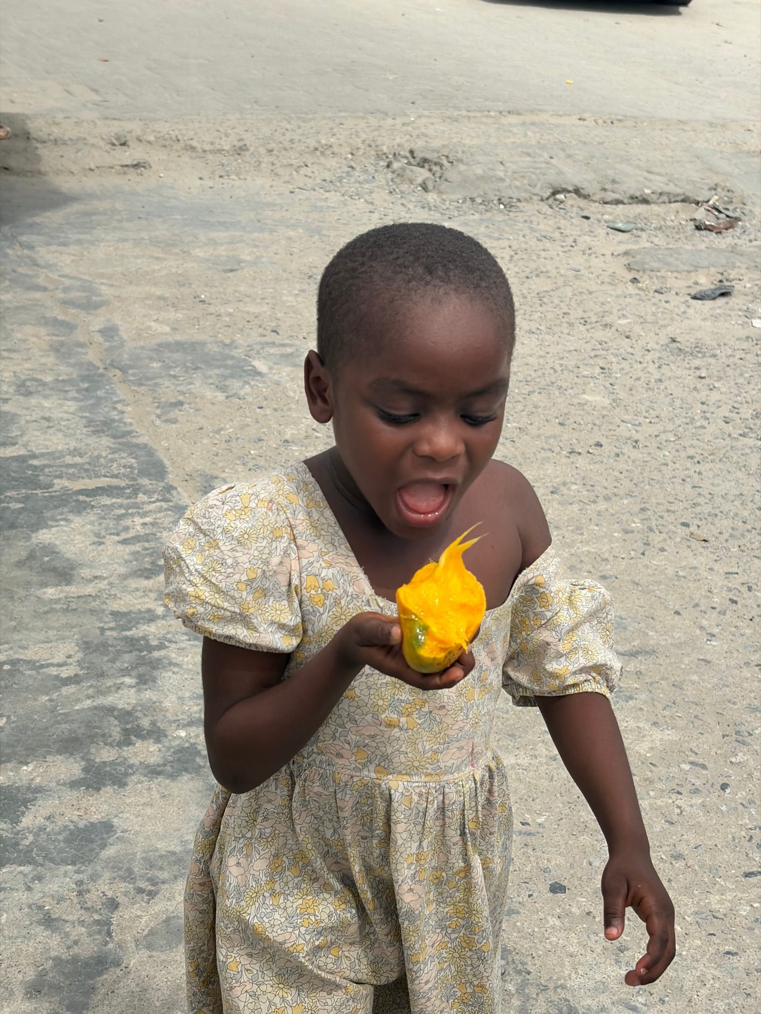A young, dark-skinned child in a floral-patterned dress stands outdoors on a concrete or paved surface. The child is holding a bright yellow fruit, possibly a mango, and appears to be taking a bite or…read more