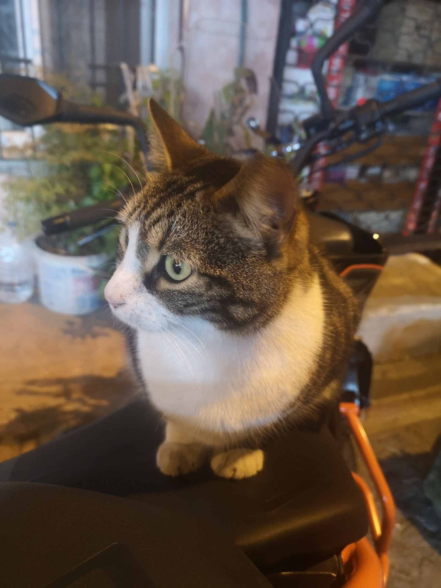 A medium shot shows a domestic cat sitting on a dark-colored motorcycle seat. The cat is a tabby with white markings on its chest and face. It has green eyes and a pink nose. The cat is looking to the…read more